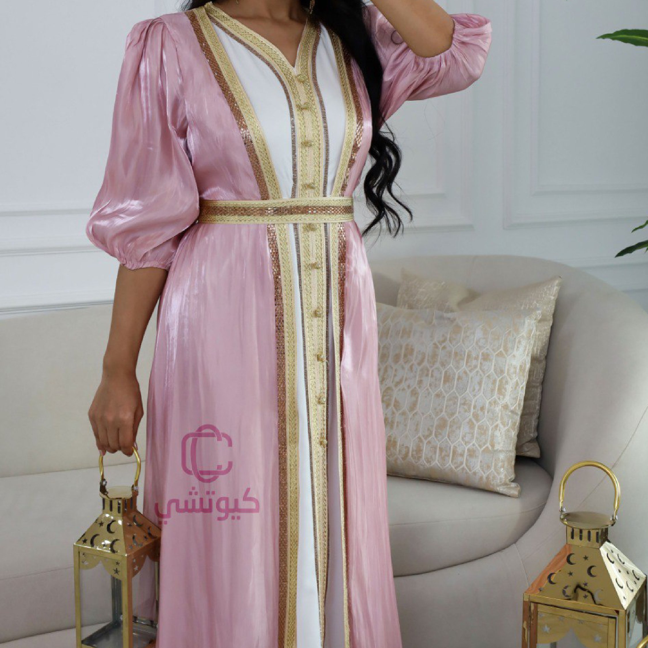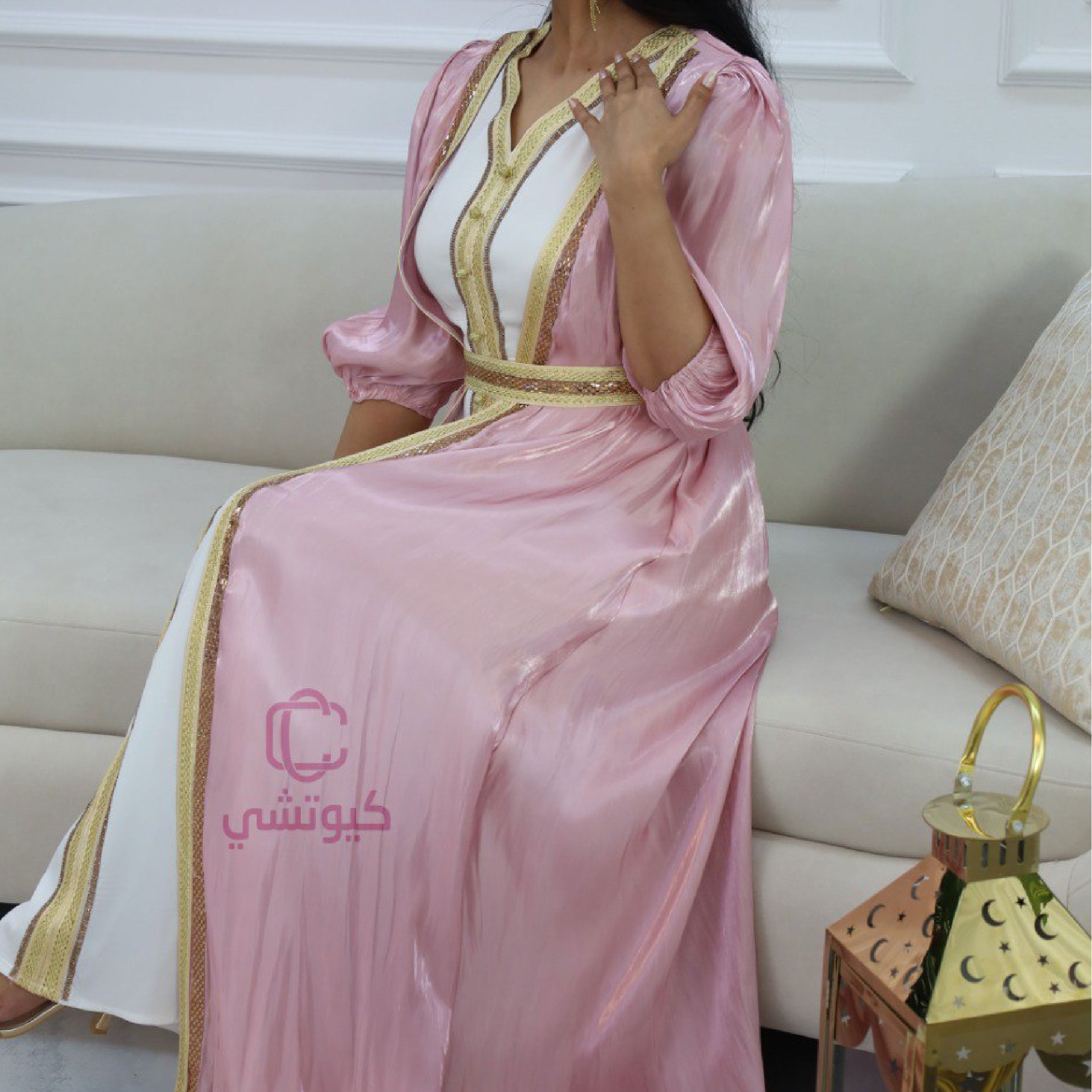 - اللون والقماش: بشت لحمي حريري فاخر مع فستان داخلي أبيض يمنحك أناقة مريحة وانسيابية ساحرة.