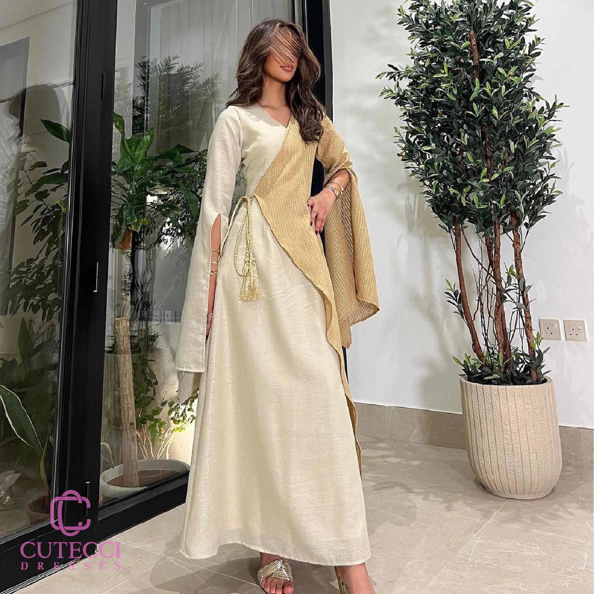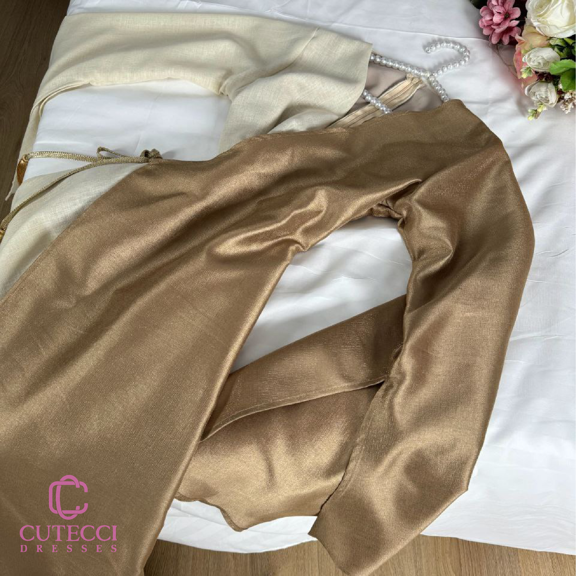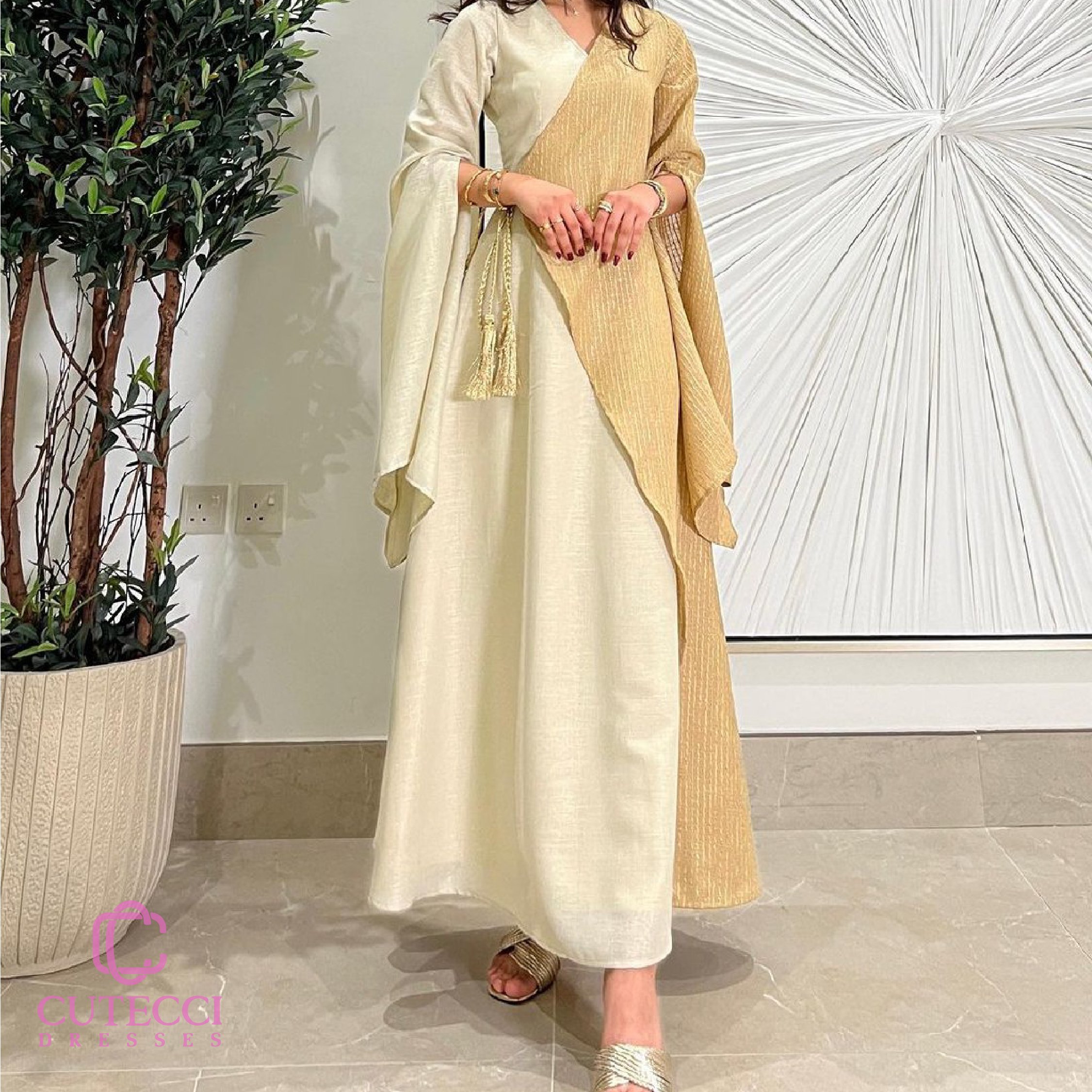 تألقي مع جلابية بيج وذهبي هندية فخمة من Cutecci، تصميم يجمع بين جلابيات طويلة أنيقة وفخامة فساتين هندية ملكية.