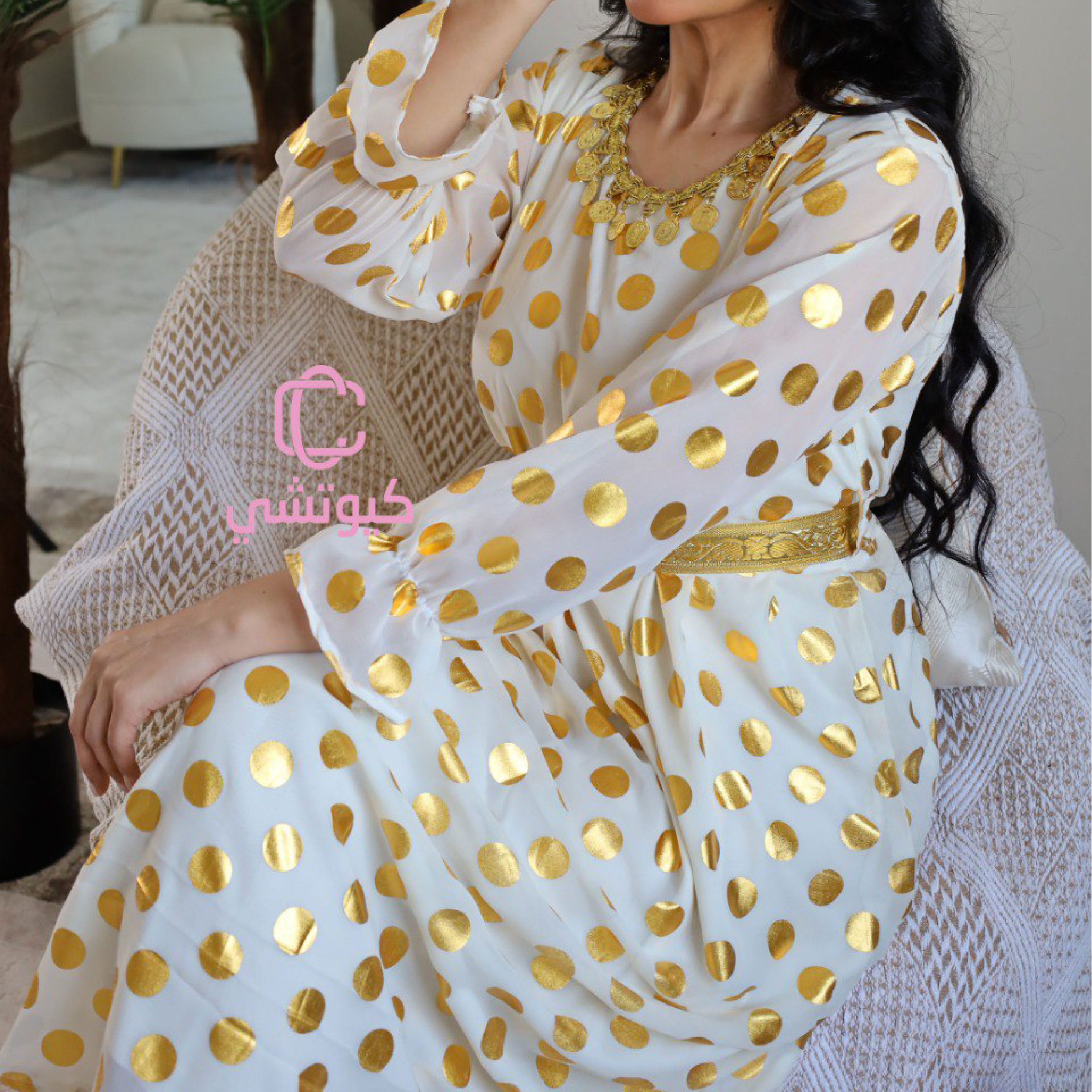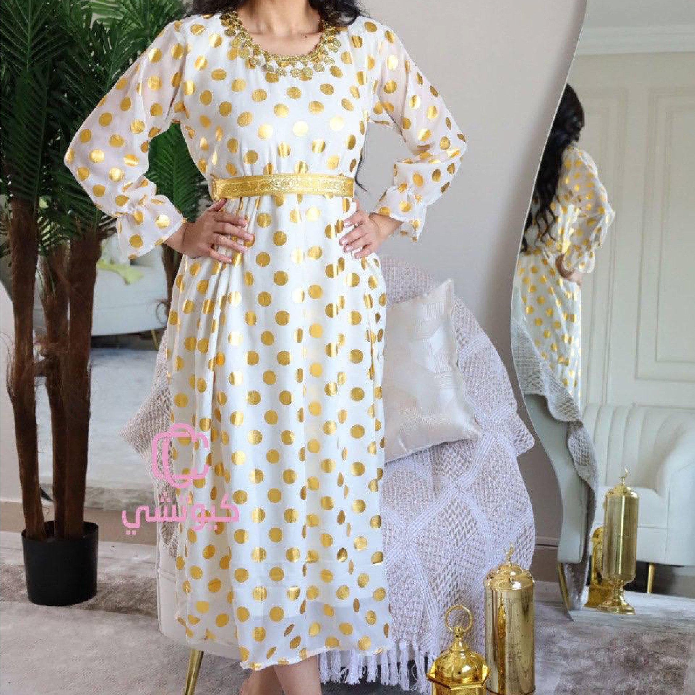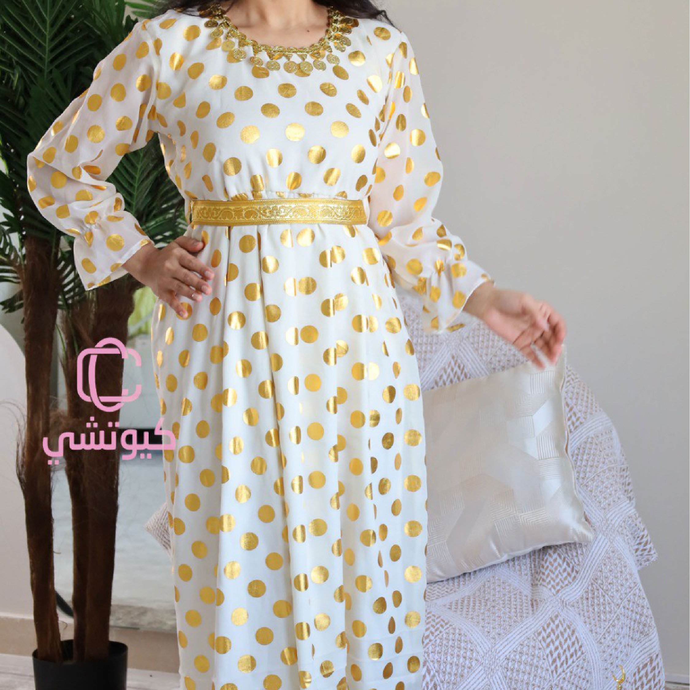 تألقي مع جلابية بيضاء منقطة ذهبية فخمة من كيوتشي، تصميم أنيق يناسب رمضان والعيد مع خامة فاخرة وحزام ذهبي جذاب ✨ اختاريها الآن.
