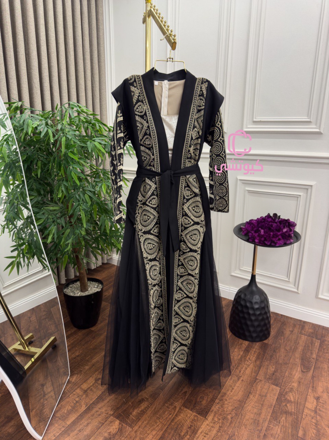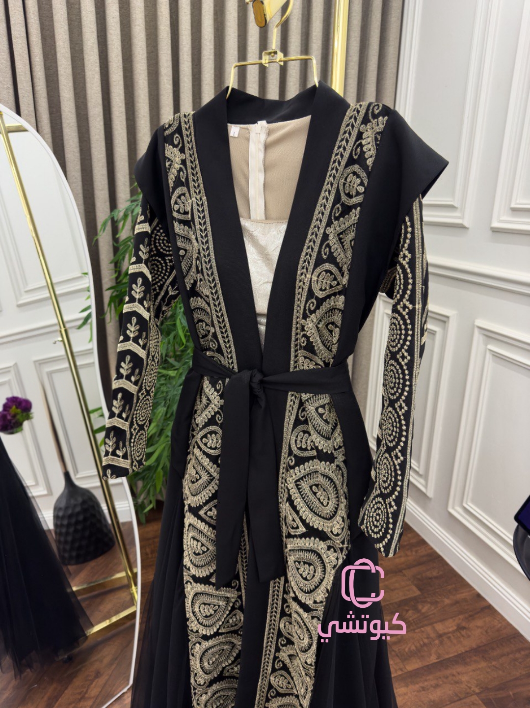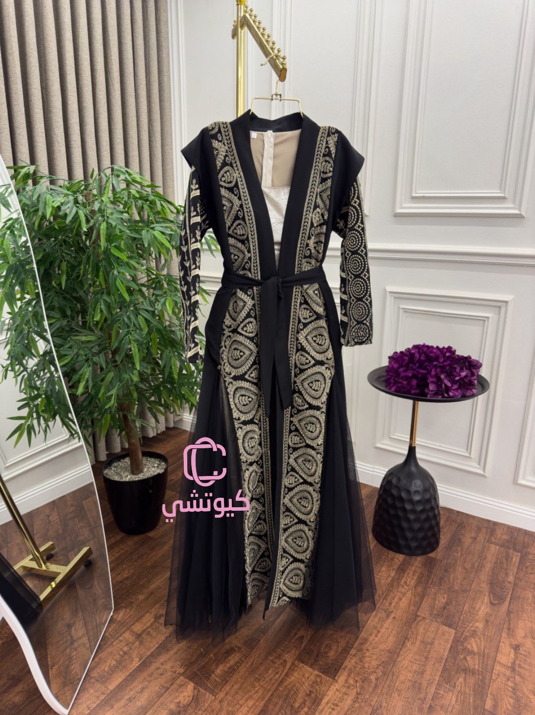 لو كنتِ تدورين عن إطلالة ساحرة تناسب أجواء رمضان والسهرات أو جمعات العيلة، جلابية كيوتشي من القطعتين بتصميم باربي بتكون خيارك الأول! الجلابية بلون أسود أنيق مع تطريزات ذهبية تعطيك فخامة ولمسة ملكية مستحيل تلاقينها بأي مكان ثاني.