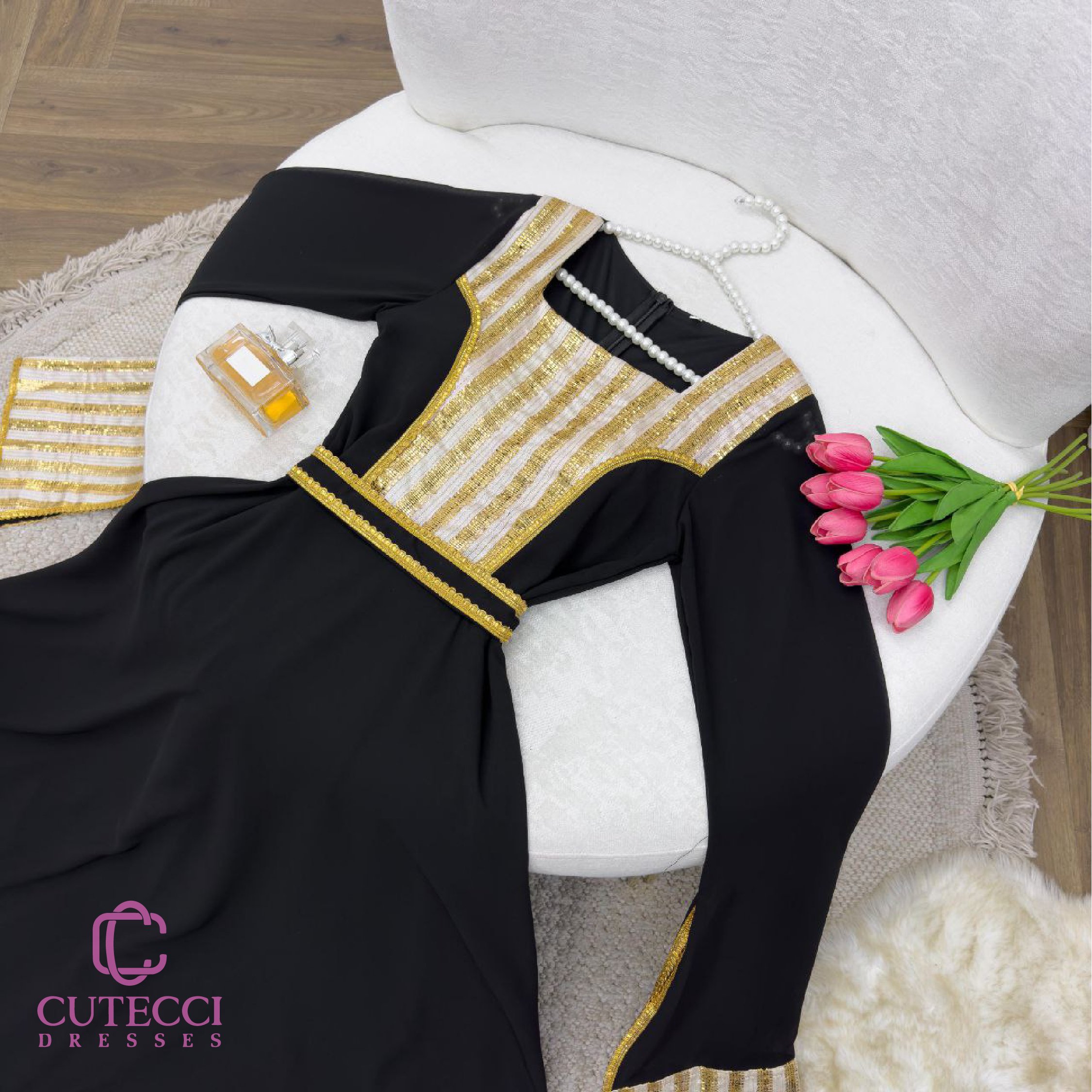 - اللون والقماش: تأتي باللون الأسود الفاخر مع تطريزات ذهبية لامعة، مصنوعة من قماش انسيابي مريح وراقي.