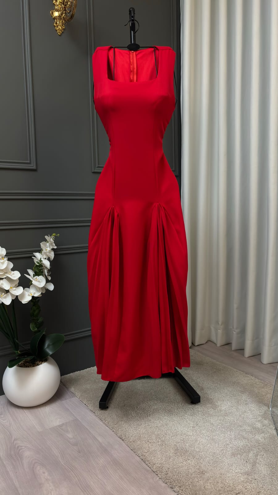 يجمع هذا التصميم بين جرأة اللون الأحمر الباربي وأناقة قصة الميدي مع كسرات راقية، ليمنحك إطلالة أنثوية تخطف الأنظار ضمن فساتين سهرة وفساتين سهره الفخمة.