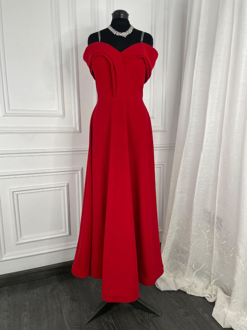 2. فستان جذاب بلون أحمر جريء وقصة أوف شولدر أنثوية، مصنوع من قماش تب فخم وتفاصيل منحوتة على الصدر، ليمنحك إطلالة راقية في المناسبات الخاصة والحفلات.