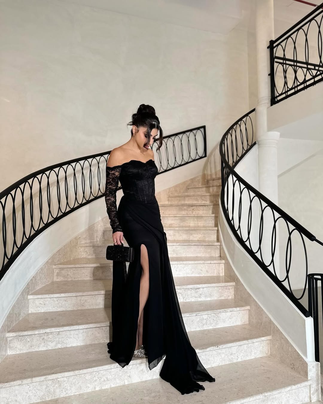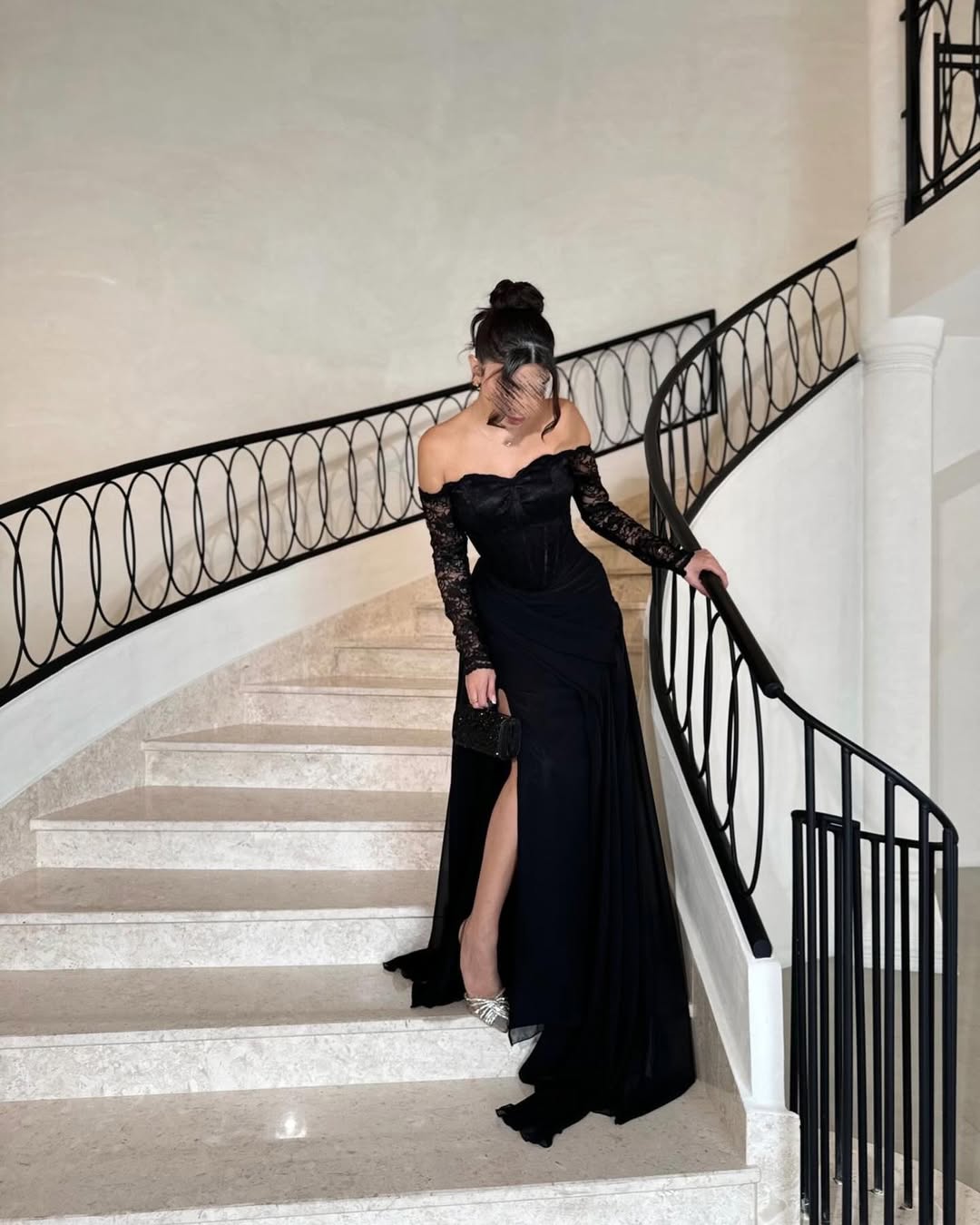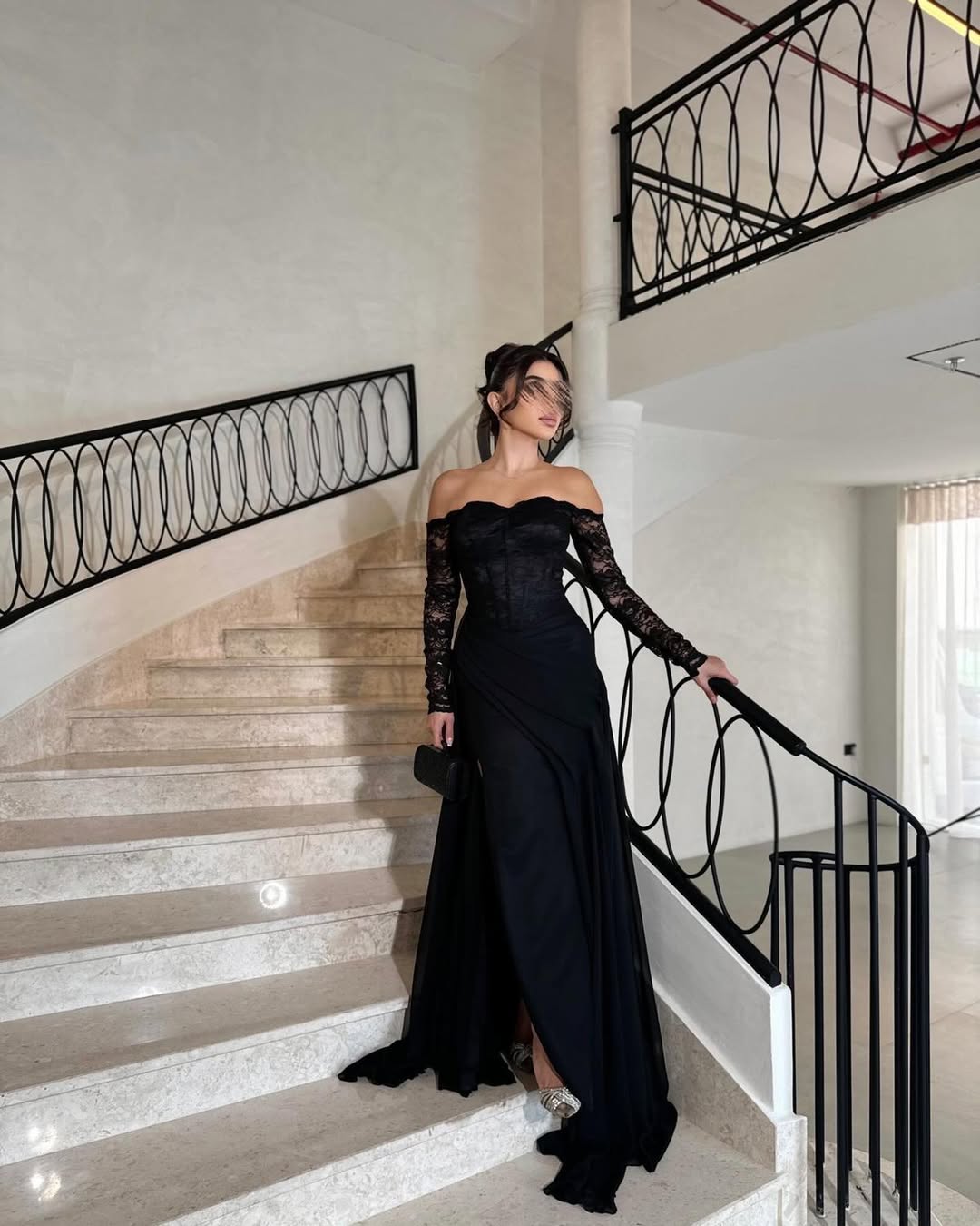 - الرقبة والأكتاف والأكمام: توب بدون أكتاف (off-shoulder) مزين برقبة دانتيل ناعمة وأكمام طويلة من الشيفون المطرز بالدانتيل الفاخر.