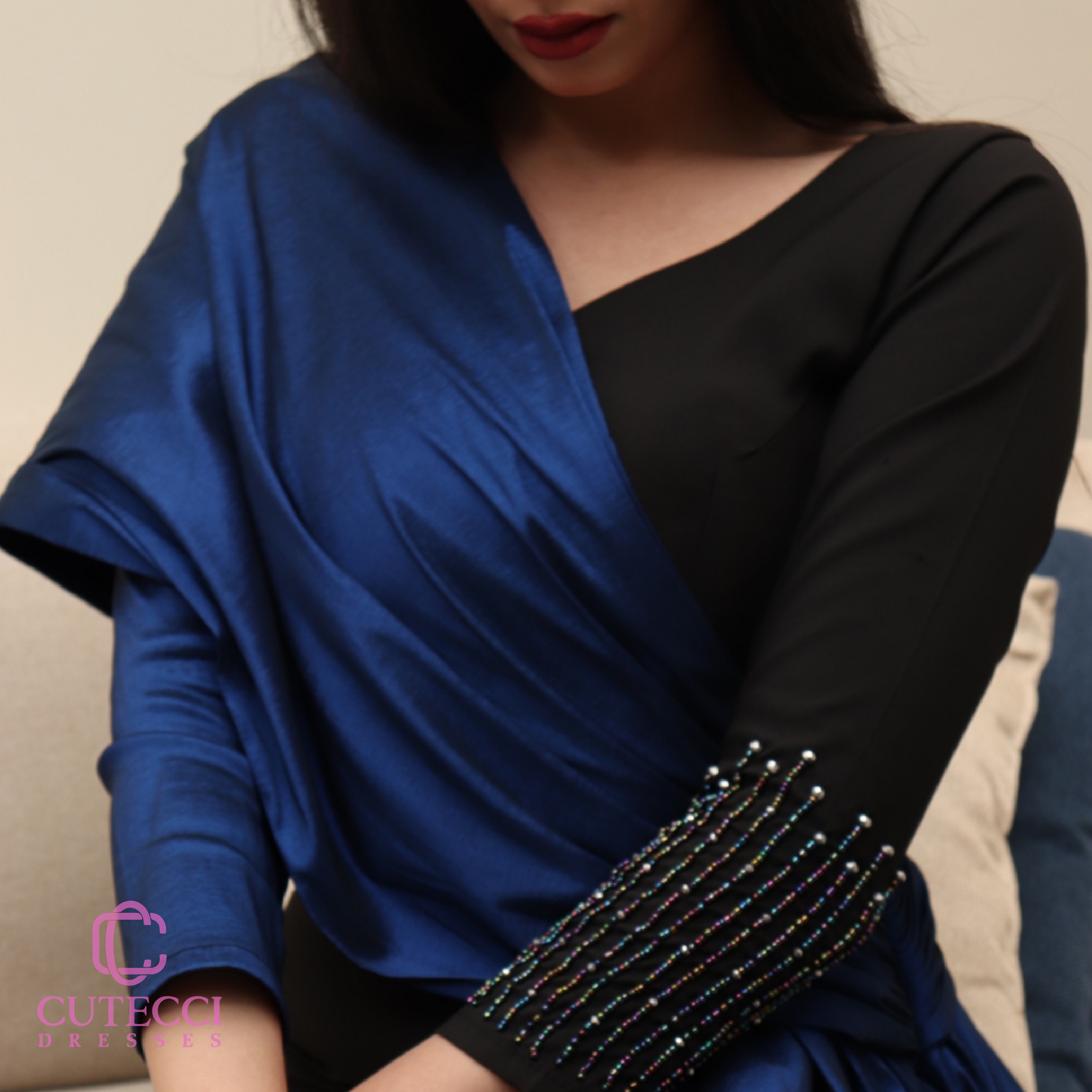 لو تدورين على فستان يميزك ويخطف الأنظار في كل ليلة، فستان السهرة بوشاح نيلي من كيوتشي CUTECCI هو خيارك الأول. الفستان جاي بتصميم أنيق يجمع ما بين الفخامة والراحة، ليناسب ذوق المرأة السعودية العصرية اللي تحب تكون متألقة في كل مناسبة.