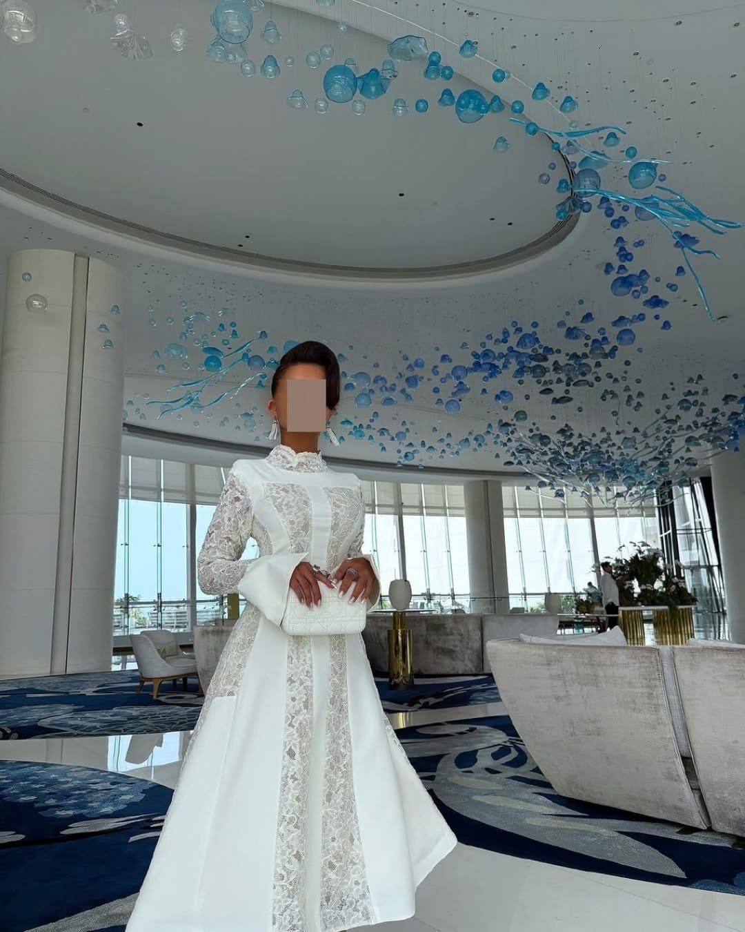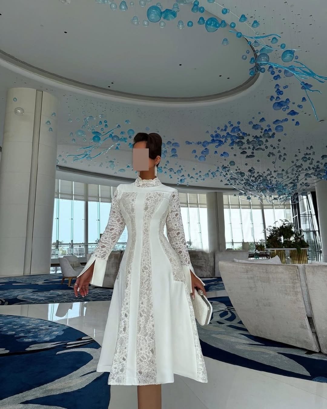 - الرقبة والأكتاف والأكمام: رقبة دائرية عالية مع أكمام طويلة كاملة من الدانتيل الشفاف.
