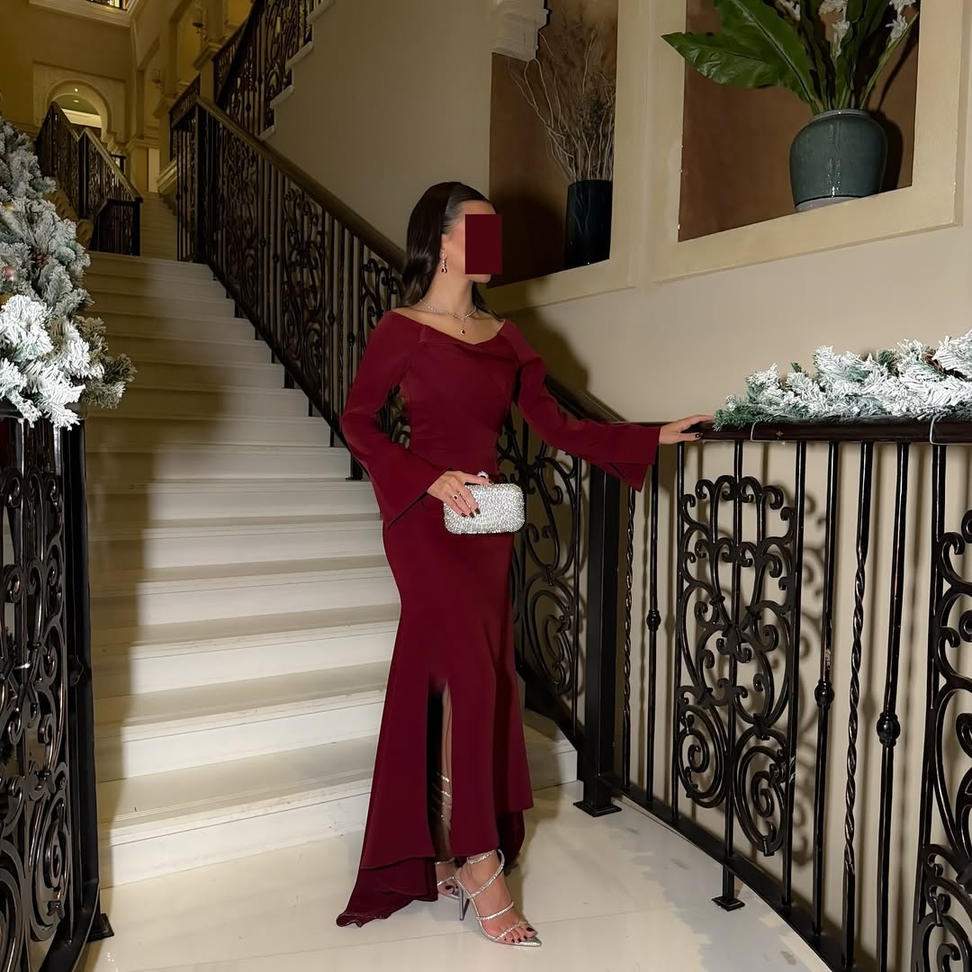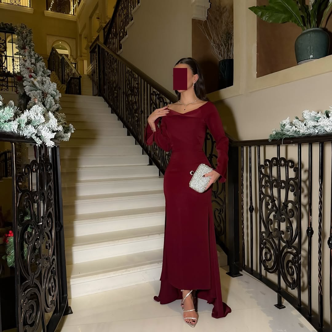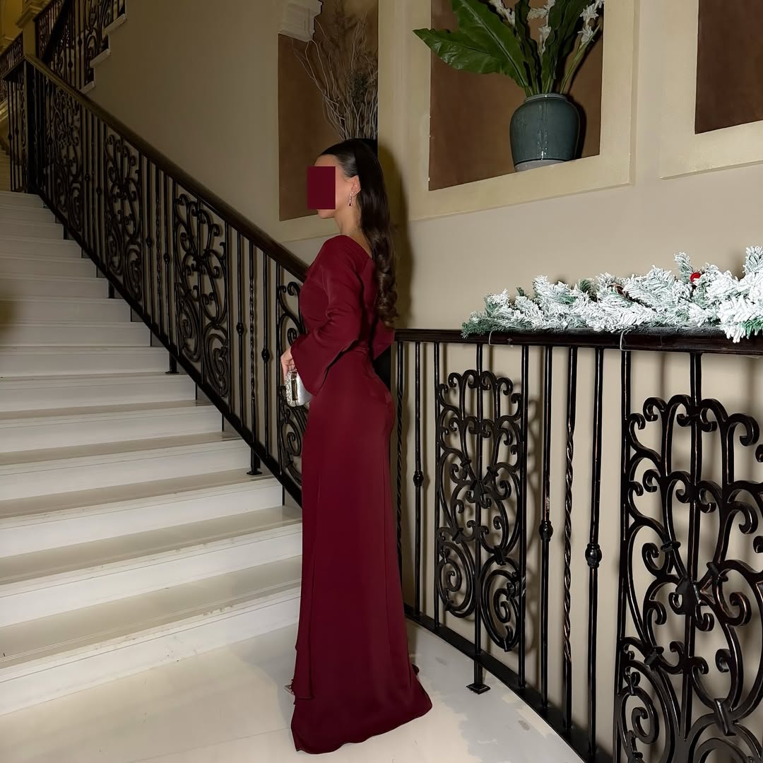 يجيك الفستان بلون عنابي (برغندي) ملكي يجمع الجاذبية والفخامة، مع قصة طويلة ساترة وأكمام أنيقة تعطي شعور بالراحة والثقة طول اليوم. تفاصيله ناعمة وعصرية: ياقة أنثوية وموديل يبرز جمال الخصر بشكل رقيق بدون مبالغة، مع ذيل أمامي منفوش قليل يضفي حركة جميلة على الفستان.