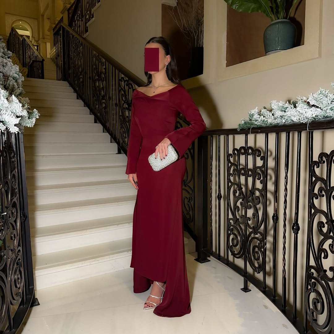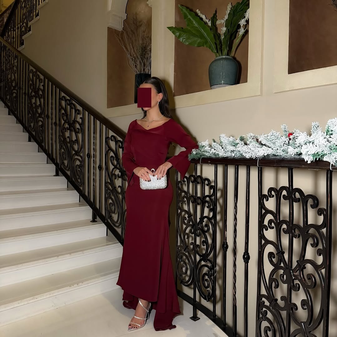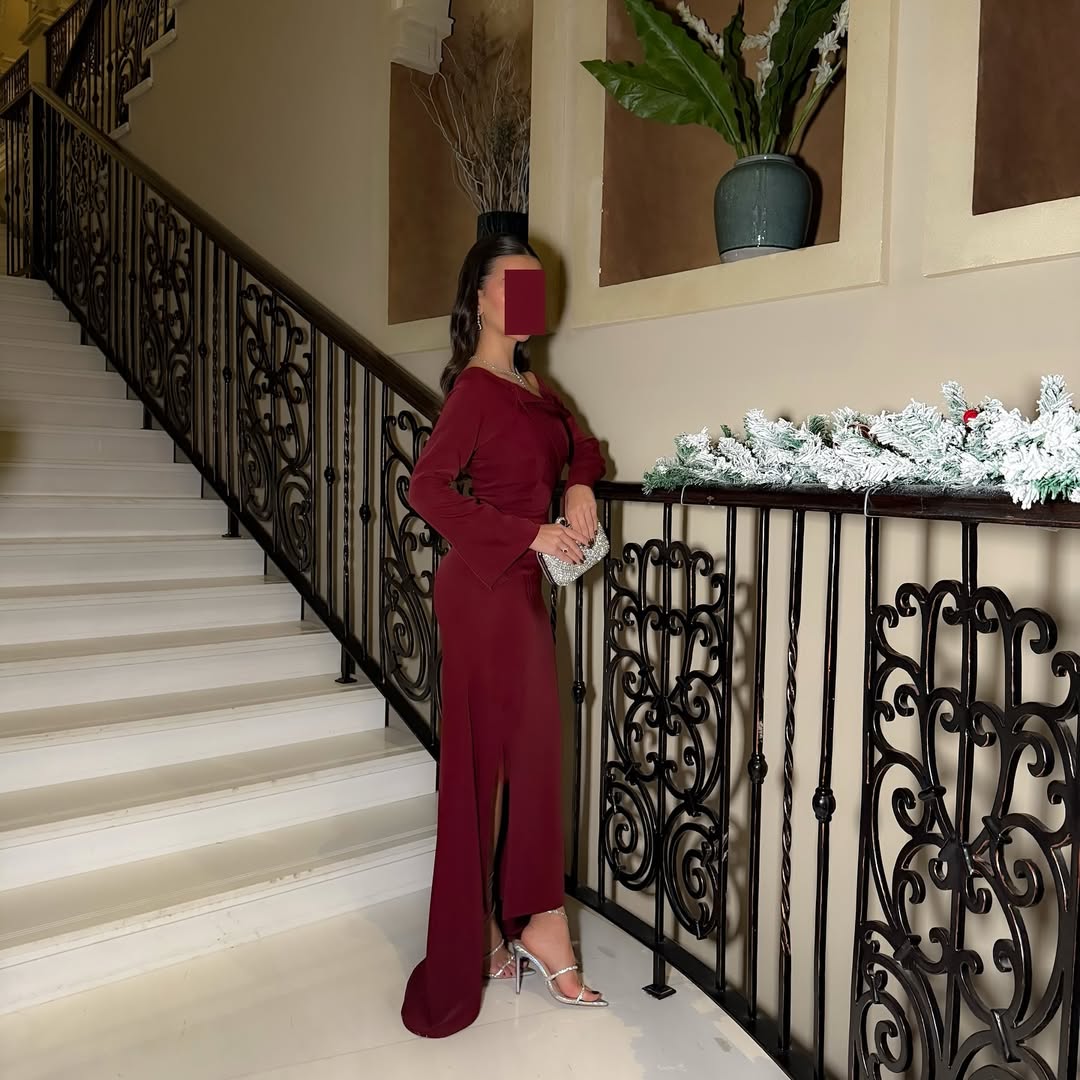 يجيك الفستان بلون عنابي (برغندي) ملكي يجمع الجاذبية والفخامة، مع قصة طويلة ساترة وأكمام أنيقة تعطي شعور بالراحة والثقة طول اليوم. تفاصيله ناعمة وعصرية: ياقة أنثوية وموديل يبرز جمال الخصر بشكل رقيق بدون مبالغة، مع ذيل أمامي منفوش قليل يضفي حركة جميلة على الفستان.