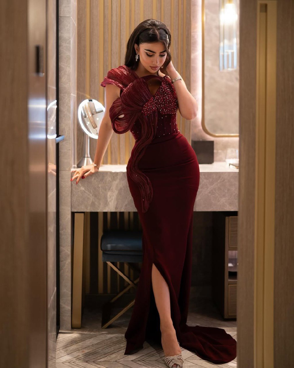 تألقي بإطلالة ساحرة مع فستان سهرة ضيق بلون برغندي غني مزود بحبات كريستال دقيقة على الصدر وتفصيلة درابية متدفقة على الجانب تضفي حركة ورونقاً لا يُقاوم.