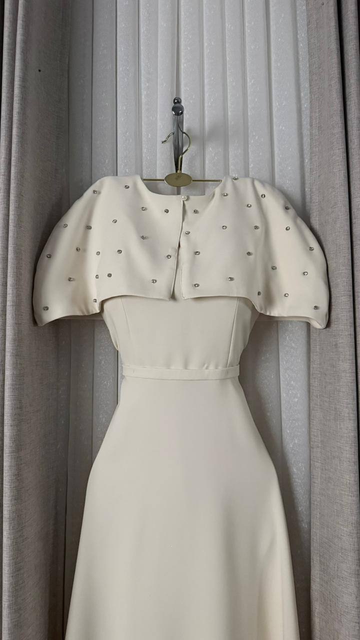 القطعة العلوية (الكاب المطرز):كاب قصير أنيق مرصع بكريستال ناعم موزع بعناية ليمنحكِ بريقًا راقيًا يشبه جلابيات مطرزة لكن بروح فساتين سهره عصرية فاخرة.