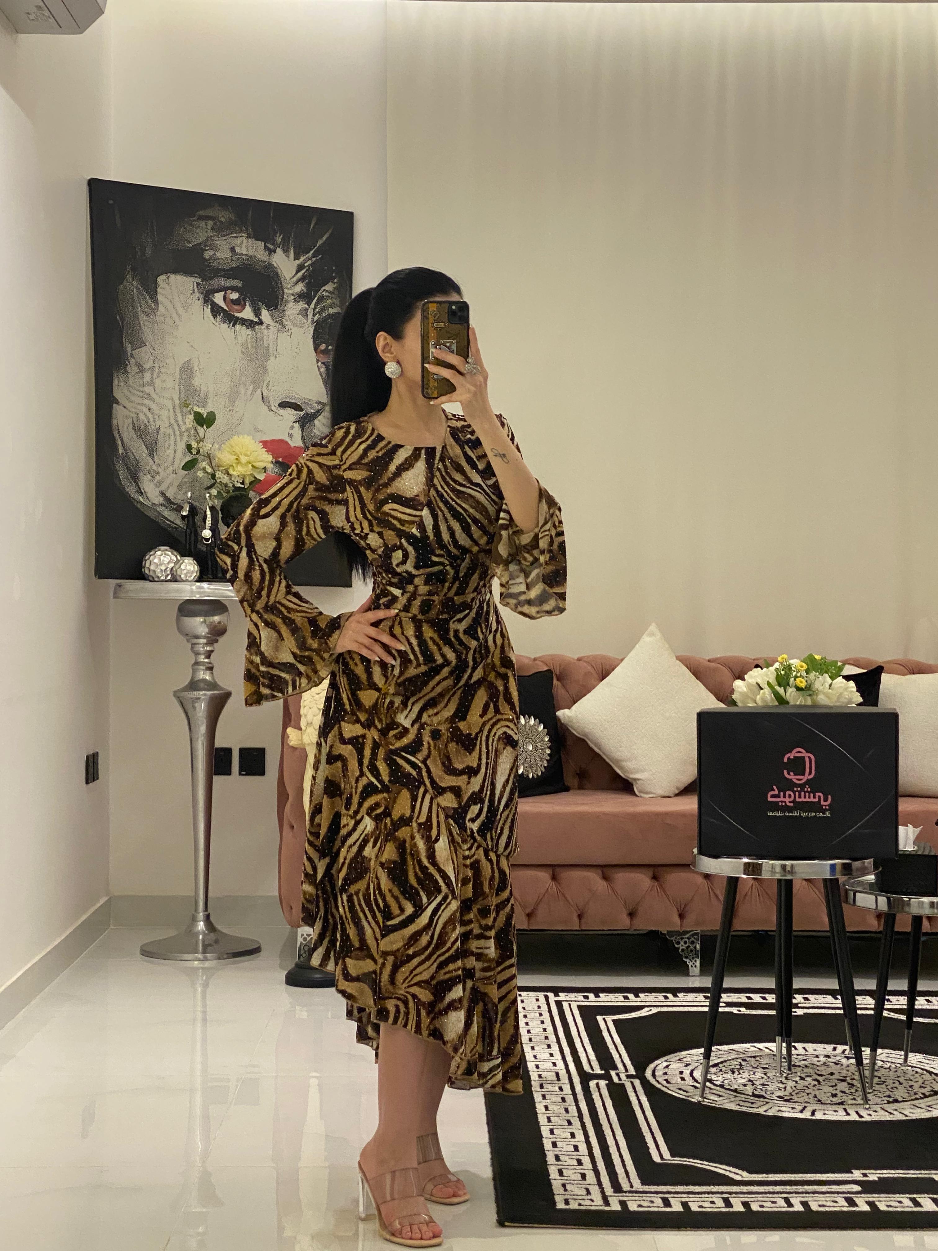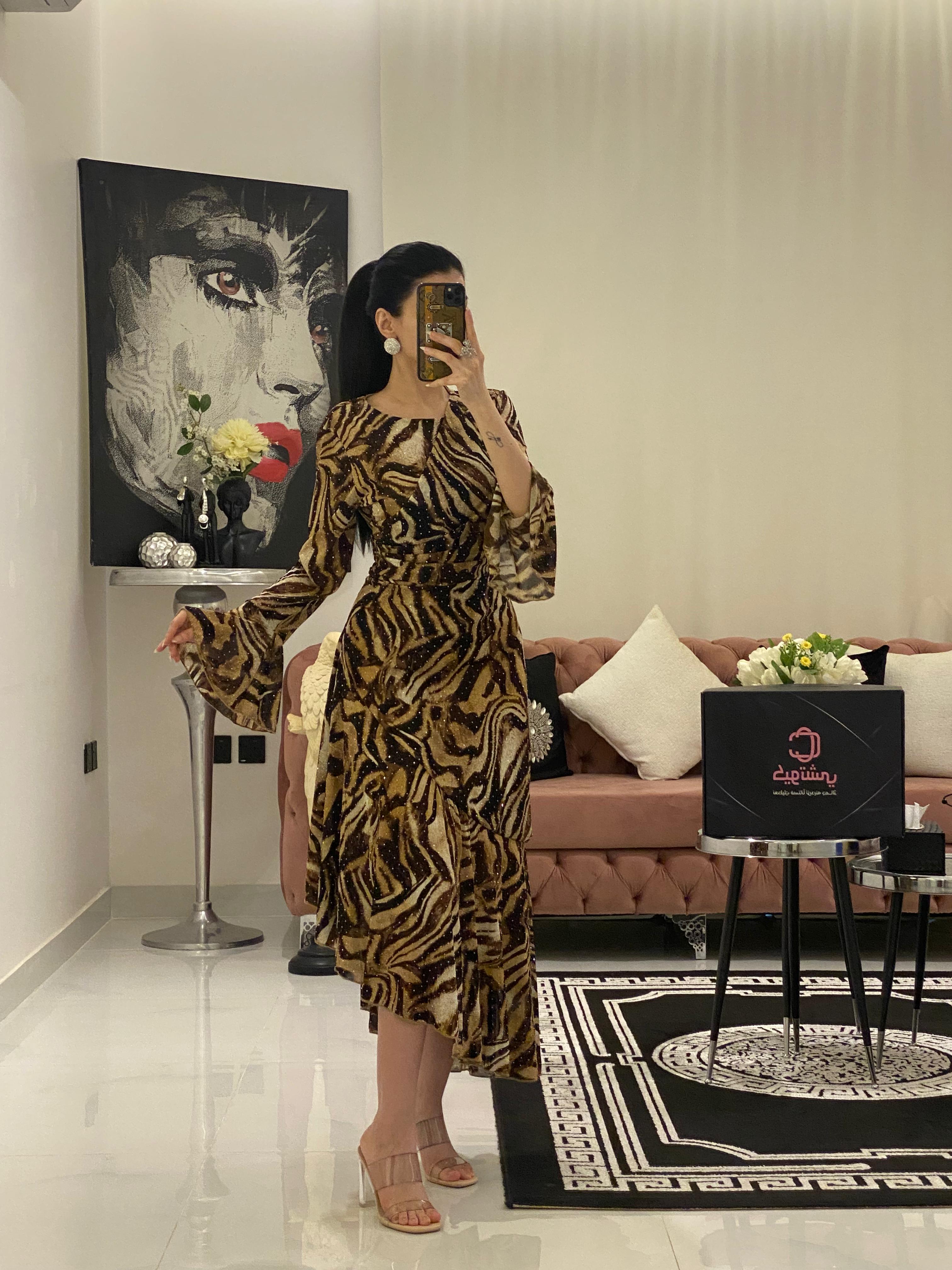 أناقة جريئة في كل تفصيلة – فستان تايجر كم طويل سواريه من Cutecci