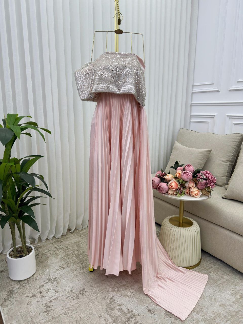 اللون الوردي الفاتح ينعش إطلالتك، فيما يمنحك التطريز الفضي بريقًا راقيًا في كل حركة.