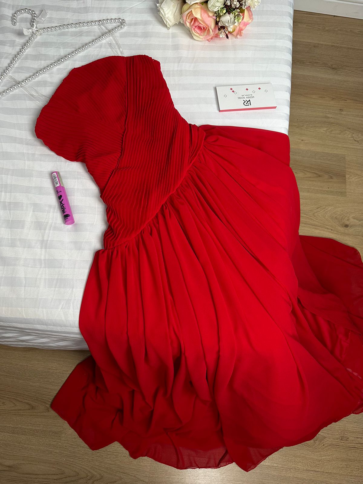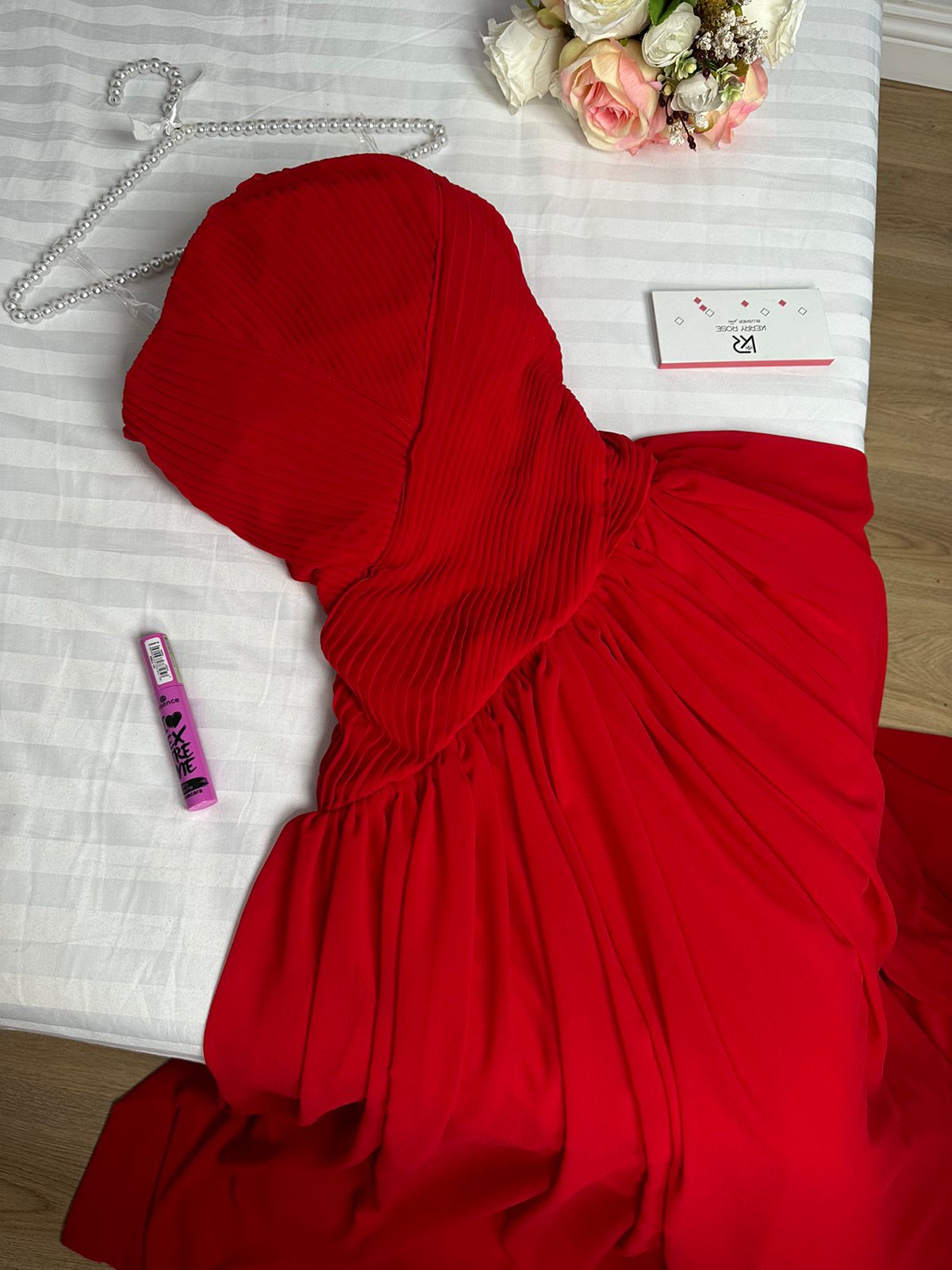 تألقي في ليلة خطوبتك مع فستان خطوبة أحمر مكشوف الكتفين بكسرات فخمة من Cutecci، تصميم أنثوي راقٍ بفتحة أمامية وقماش شيفون ناعم، مثالي للسهرات الفخمة والمناسبات الخاصة.