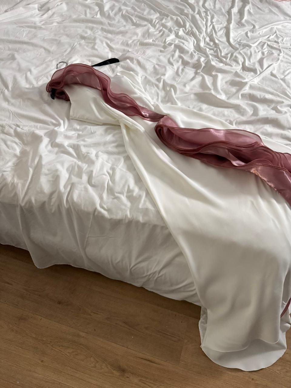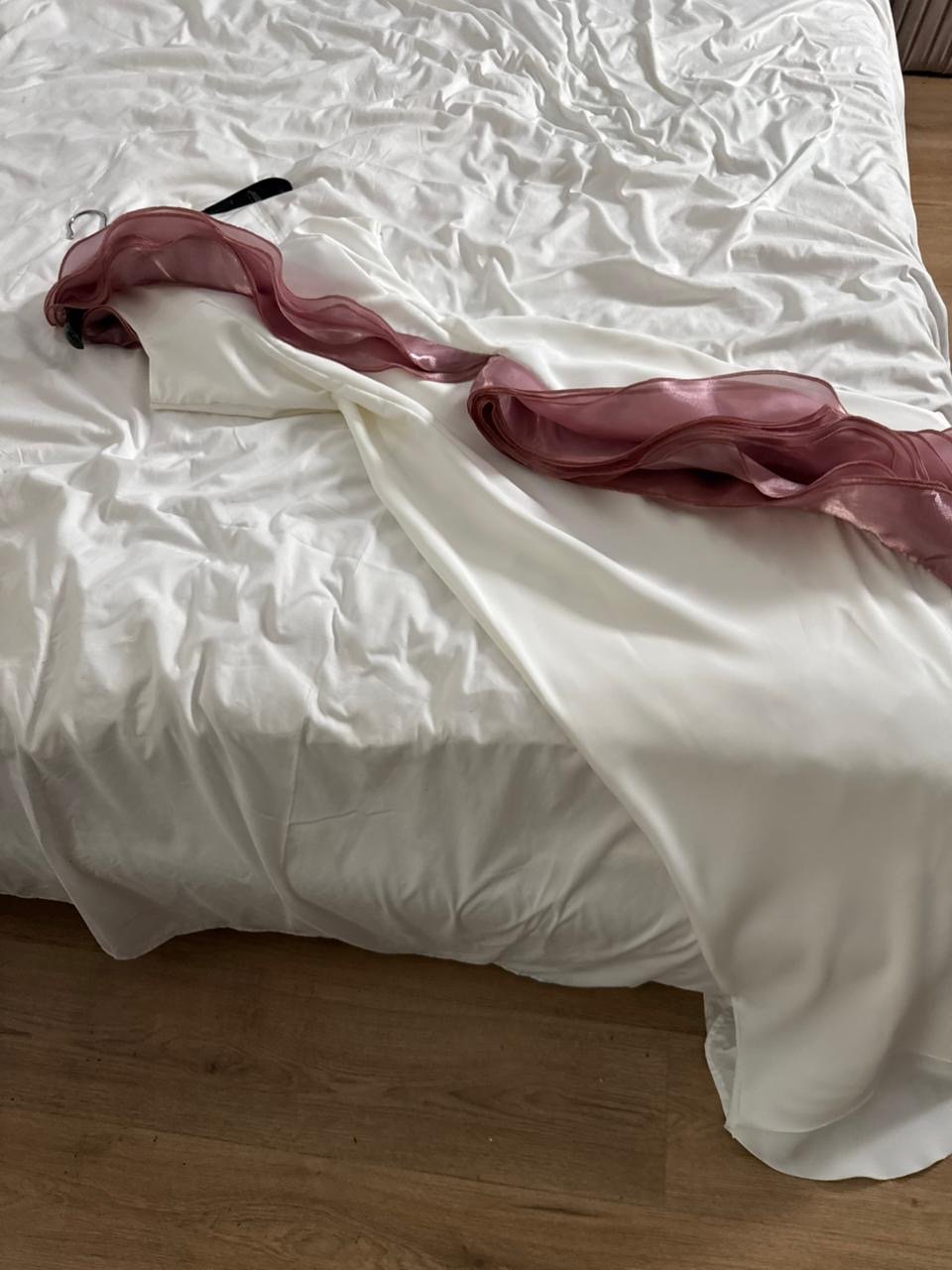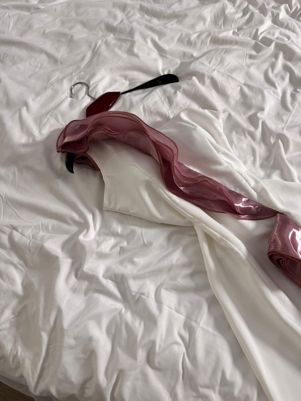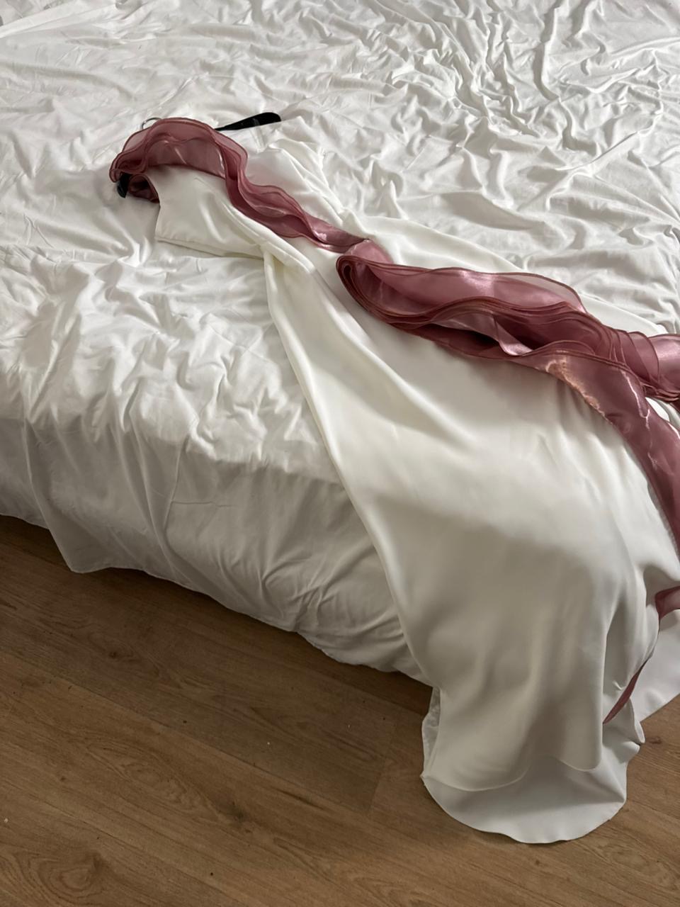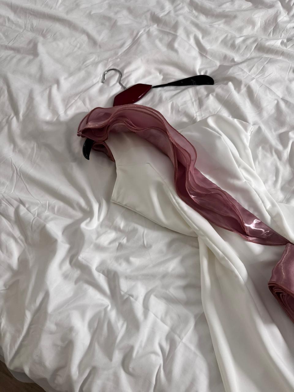 الرقبة والأكتاف والأكمام: بتصميم كتف واحد مزدان بطبقة شفافة من الشيفون الوردي المتموّج تضيف لمسة رومانسية مفعمة بالأنوثة والجمال.