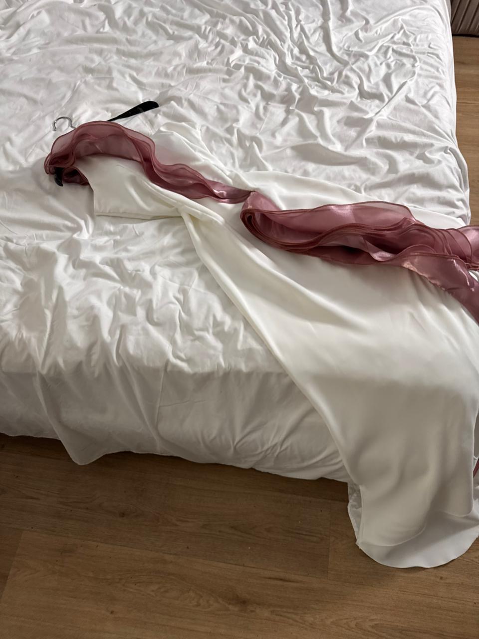 اللون والقماش: بلون سكري فاتح يوحي بالنقاء والرقي، مصنوع من خامة باربي فخمة بلمعة ناعمة وانسيابية تليق بكل ذوق أنثوي راقٍ.