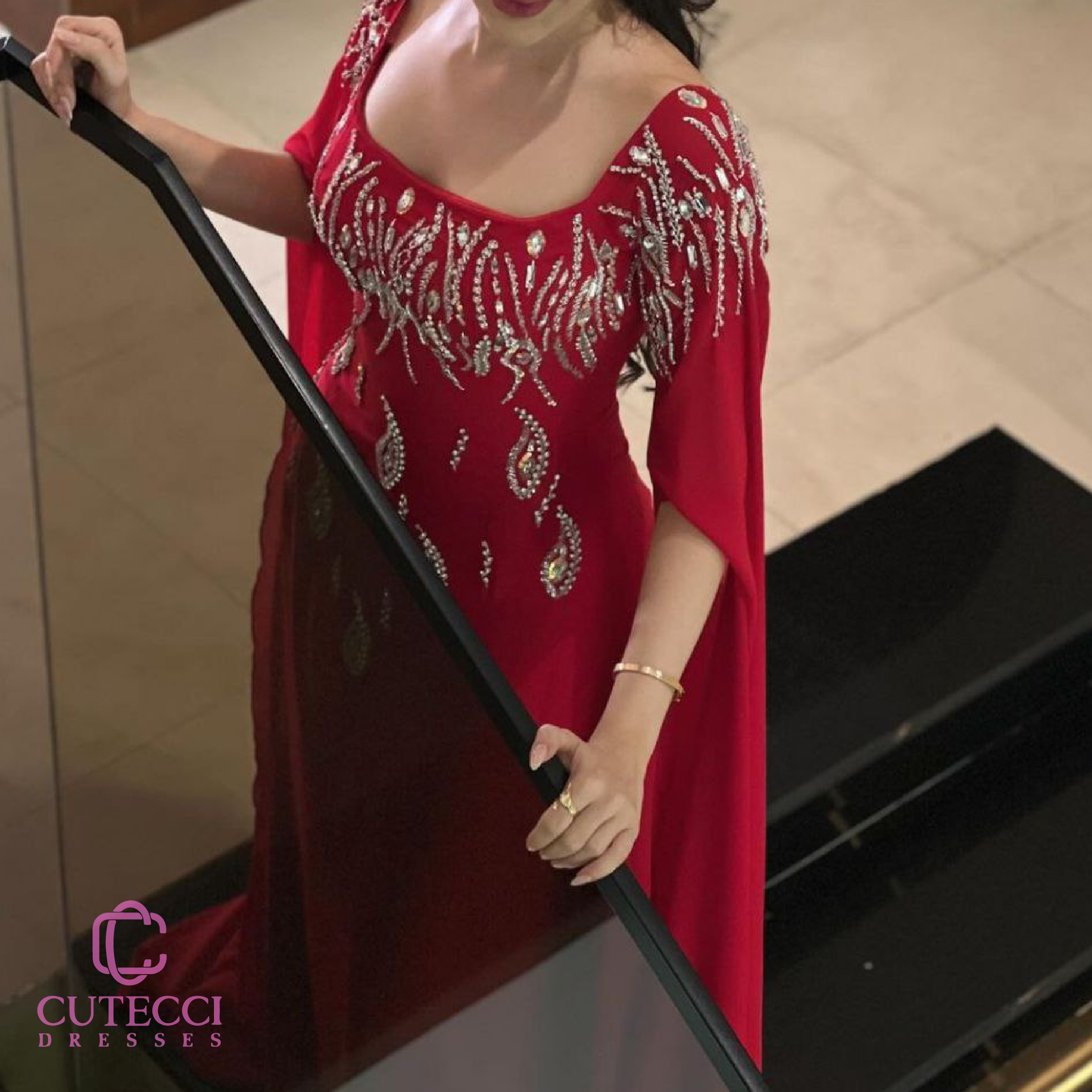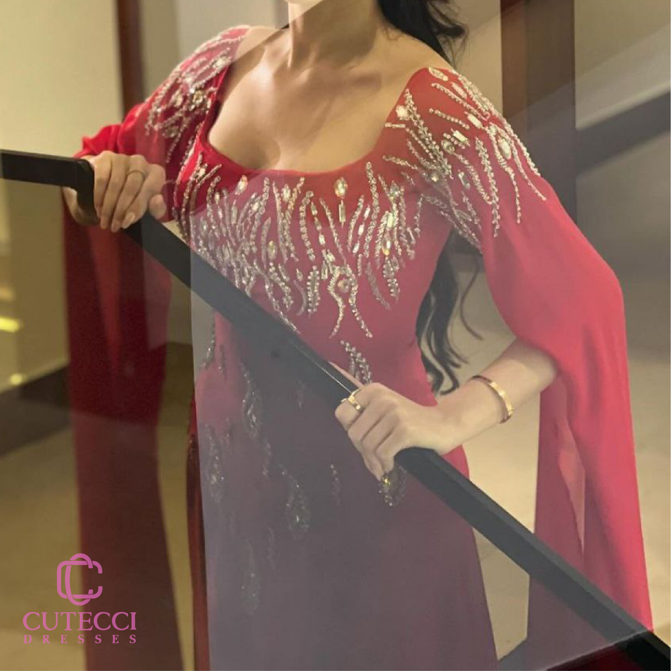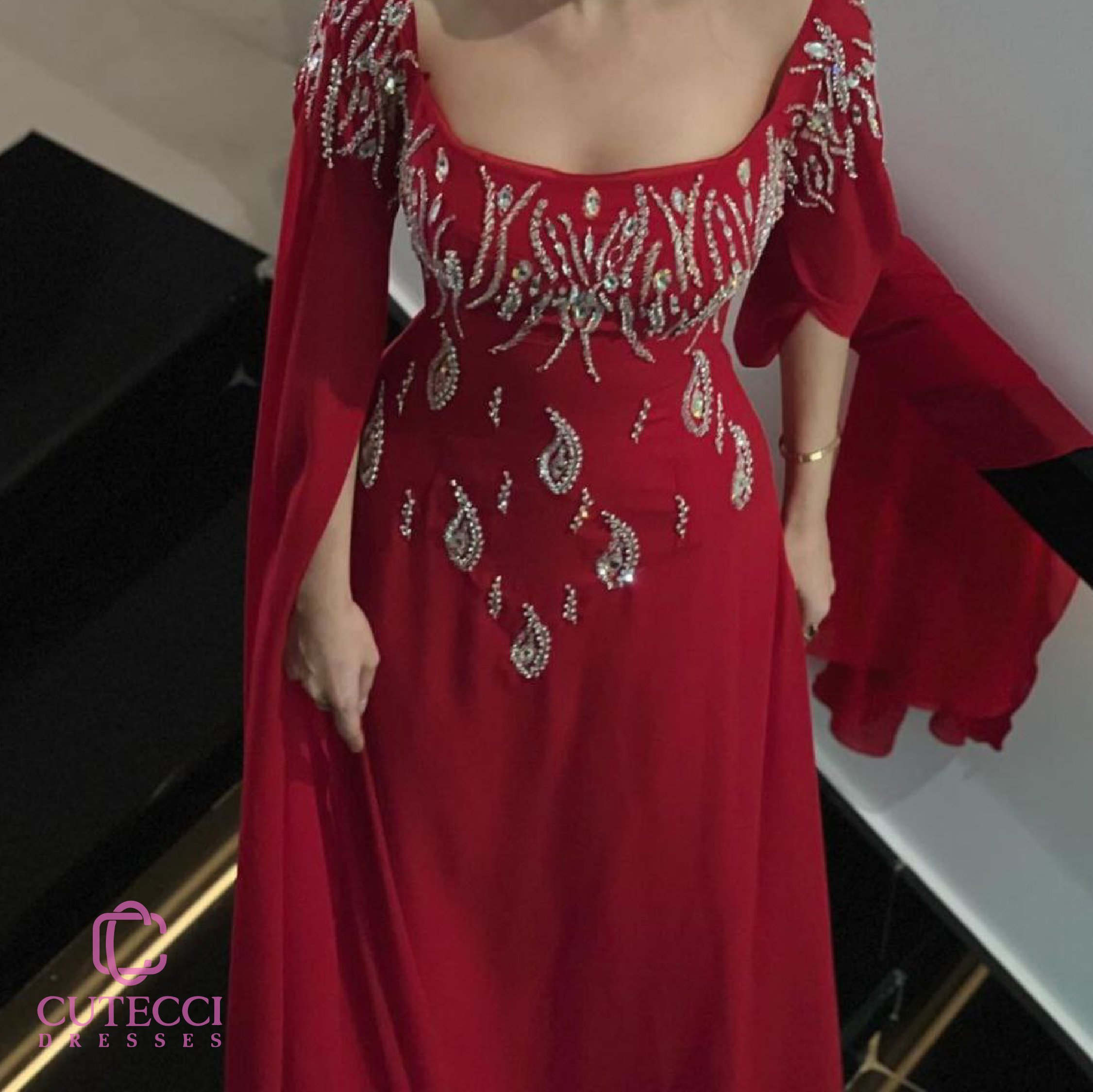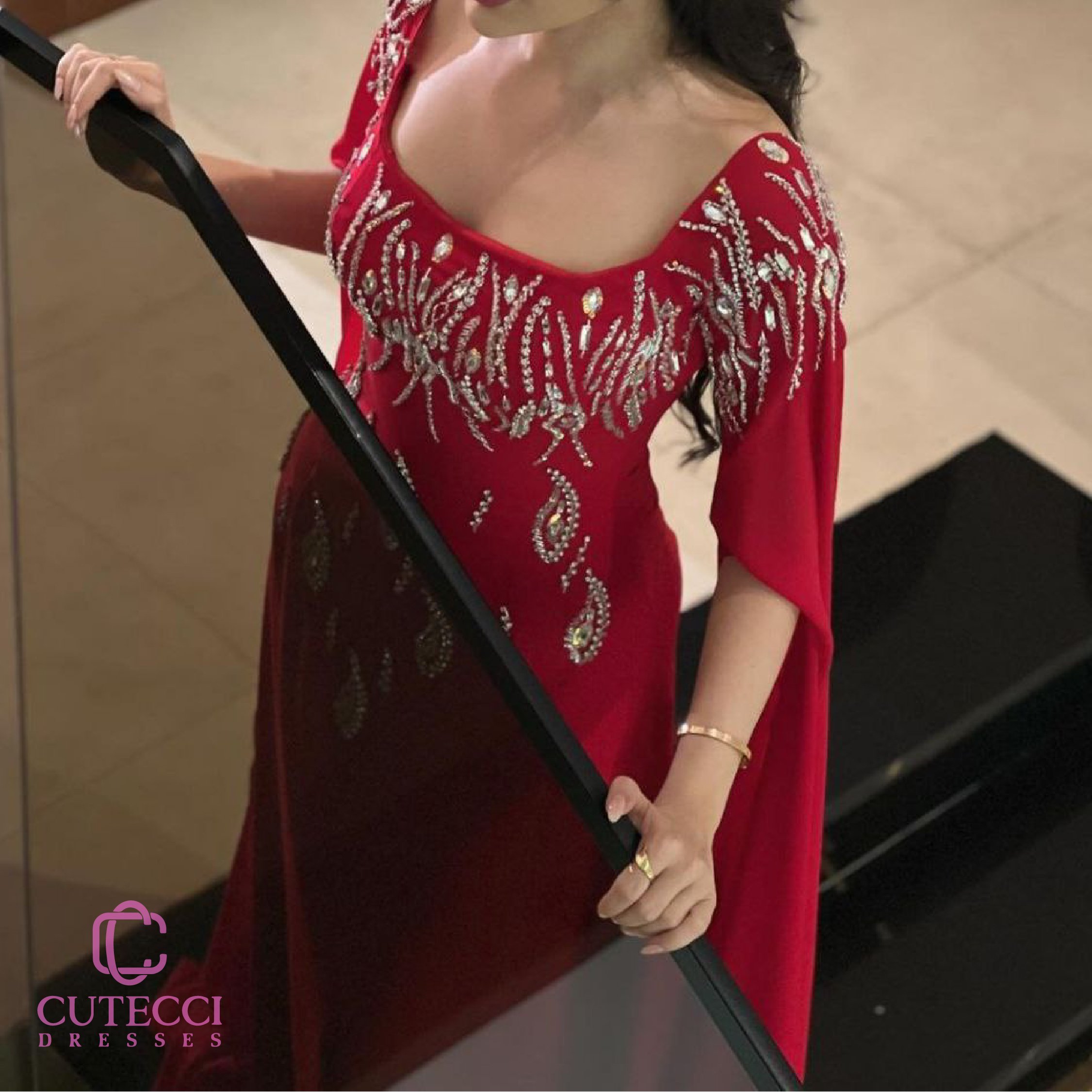فستان سهرة أحمر مطرز صدر كم طويل بتصميم ملكي فاخر لإطلالة ساحرة في المناسبات.