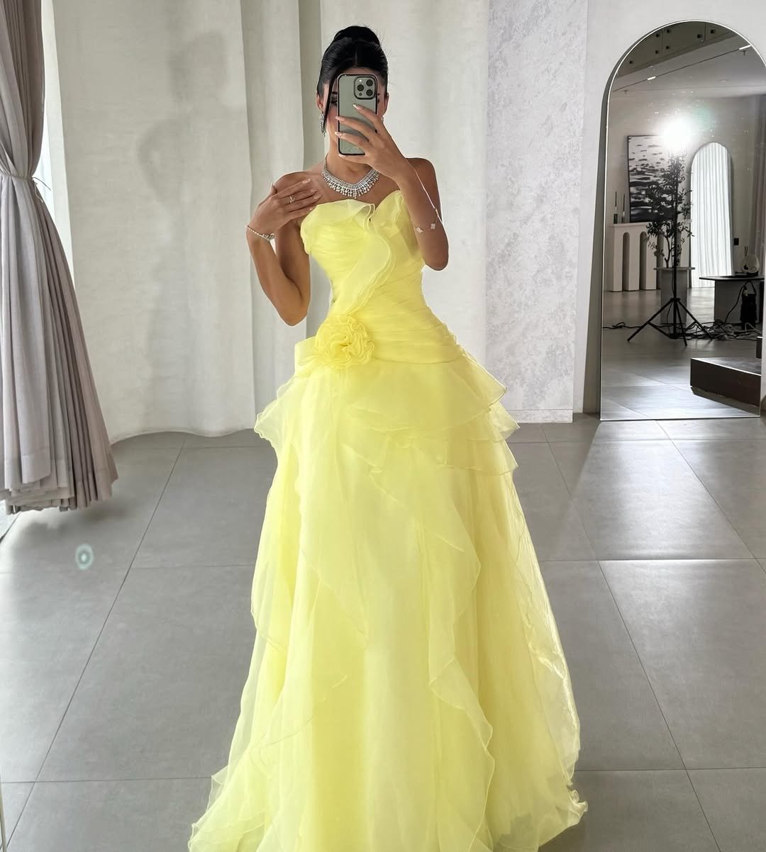 - اللون والقماش: يأتي الفستان باللون الأصفر الملكي الحيوي والمشرق، مصنوع من قماش تول فاخر يمنحك خفة وأناقة لا مثيل لها.
