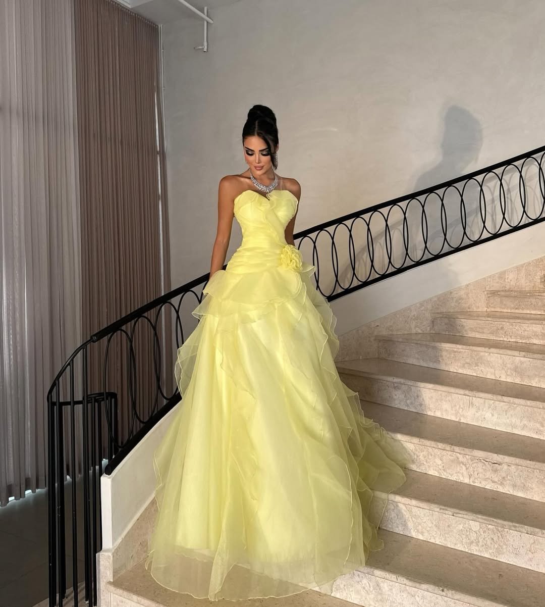 اكتشفي فستان سهرة أصفر ملكي بتصميم فاخر من التول الناعم، مثالي لمناسباتك الخاصة كالأعراس والخطوبة.