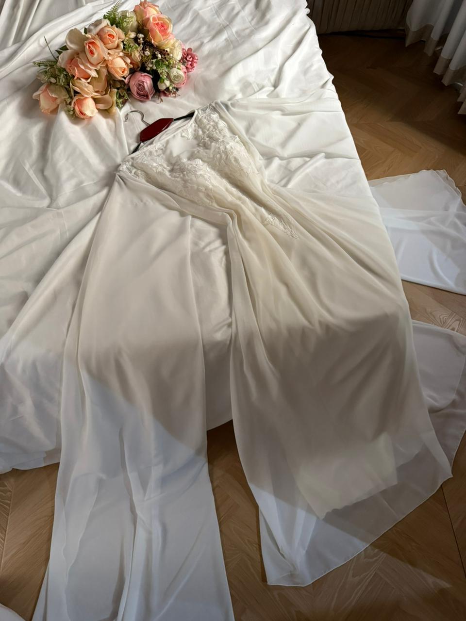 اللون والقماش: يأتي بلون أوف وايت راقٍ مصنوع من قماش حريري انسيابي ناعم يمنحك إحساس الفخامة في فساتين سهرة ويعكس نعومة فساتين سهره الراقية.