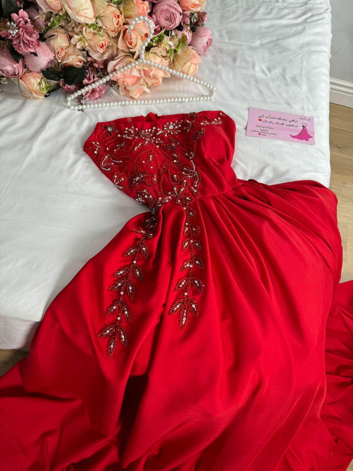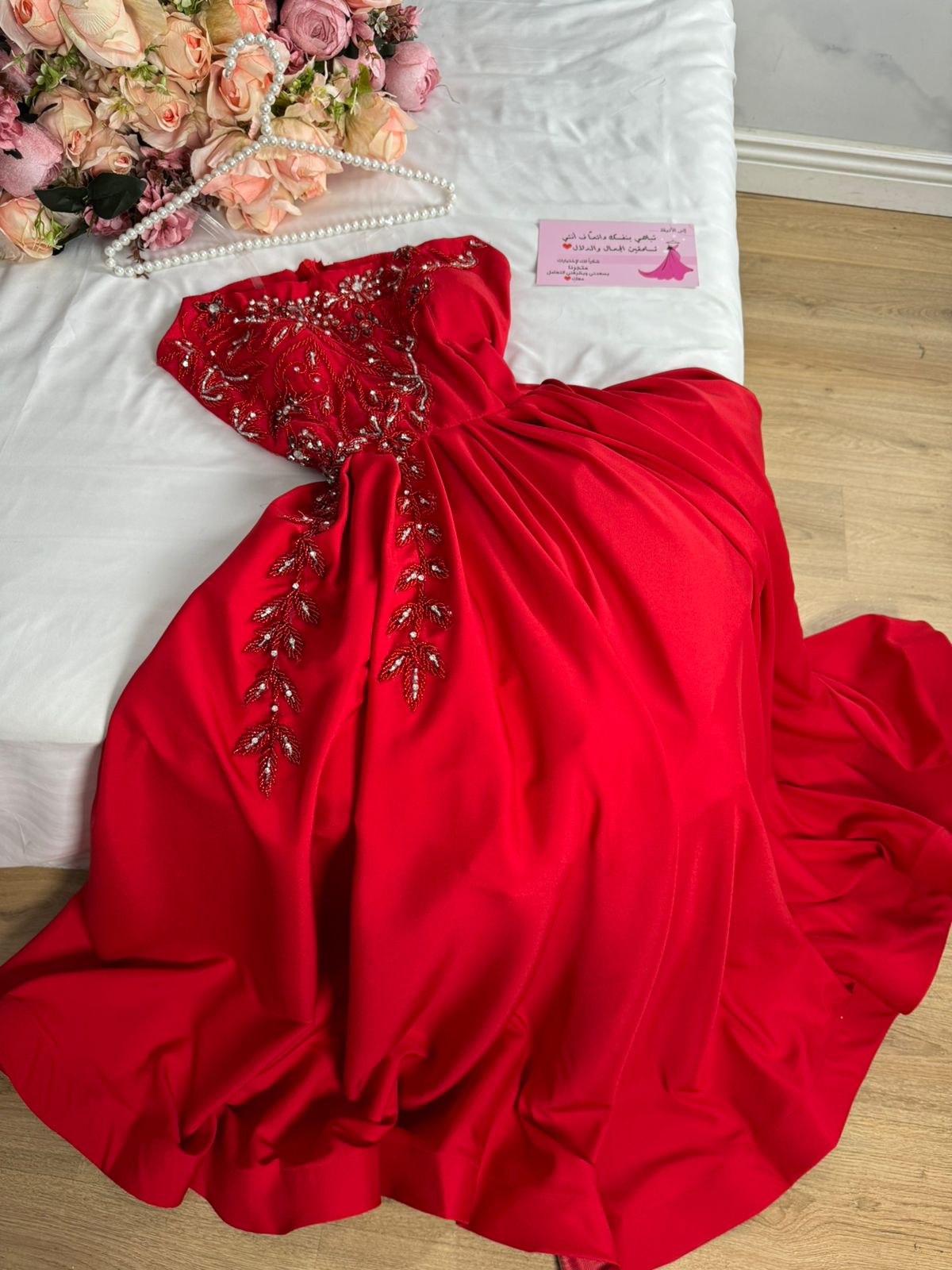 فستان مميز بلونه الأحمر الملفت وتطريزاته المتقنة التي تضيف لمسة من الفخامة والرقي، مثالي لحفلات المساء والمناسبات الخاصة.