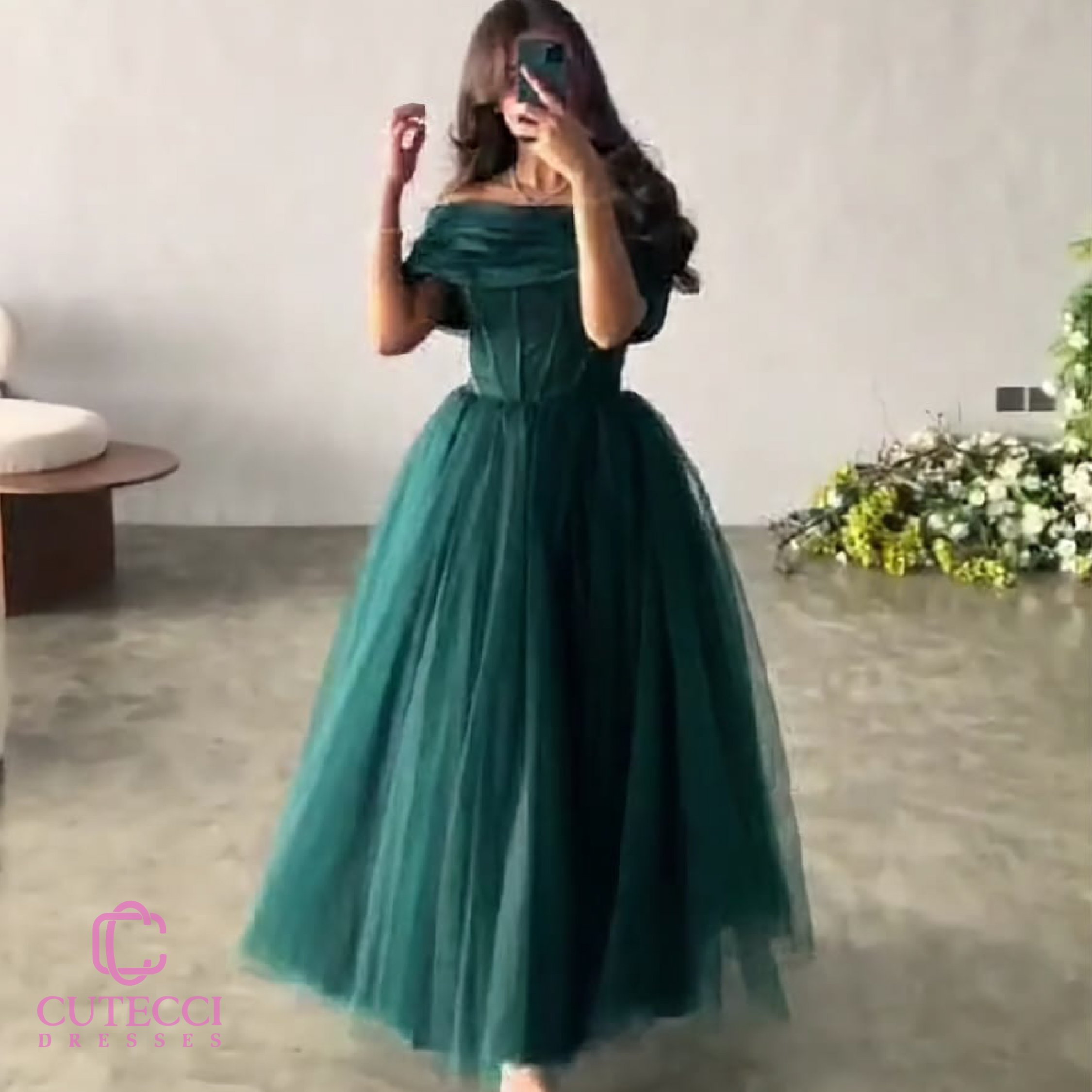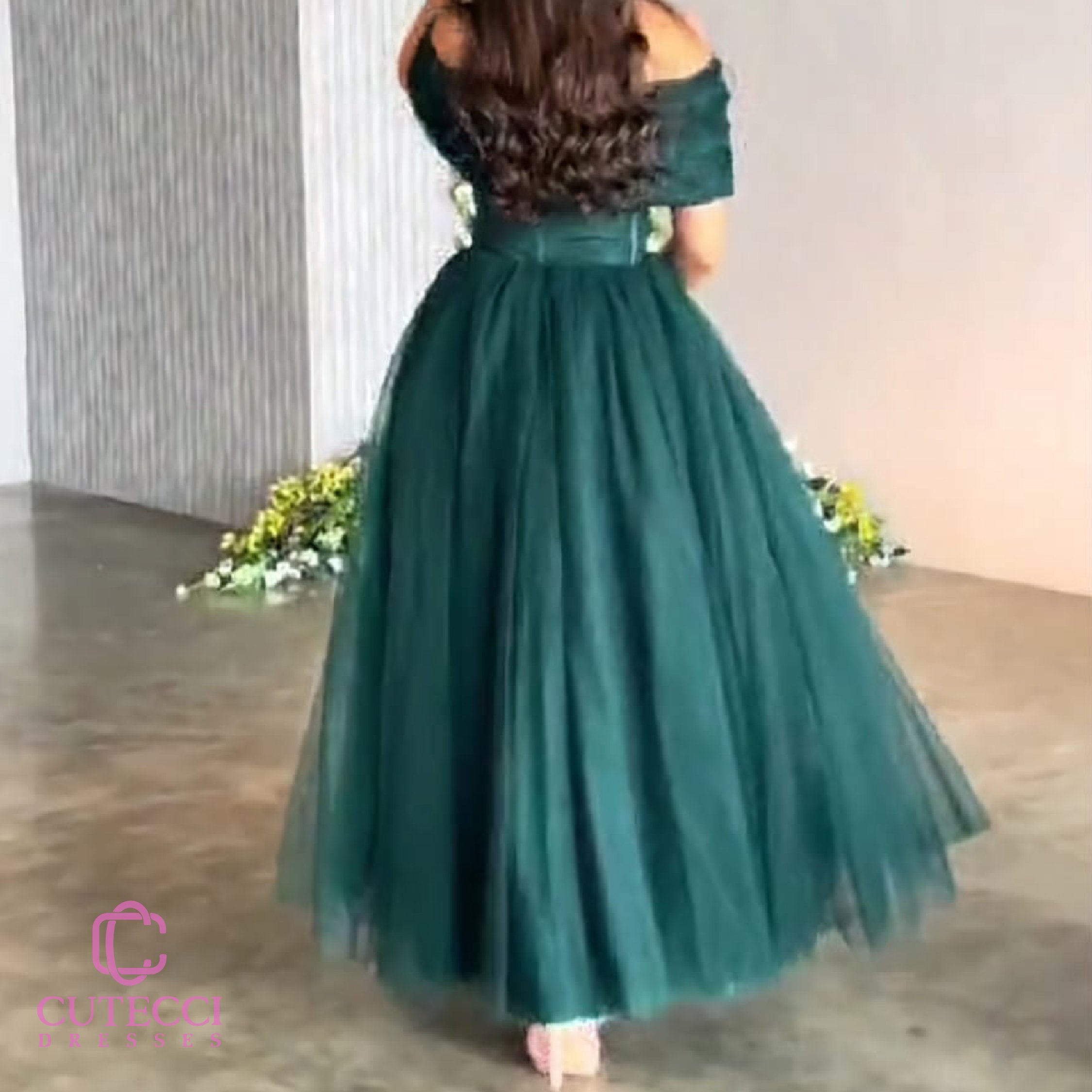 فستان سهرة بترولي تل منفوش من كيوتشي بتصميم أميري أنيق يناسب السهرات والخطوبة والزفاف.