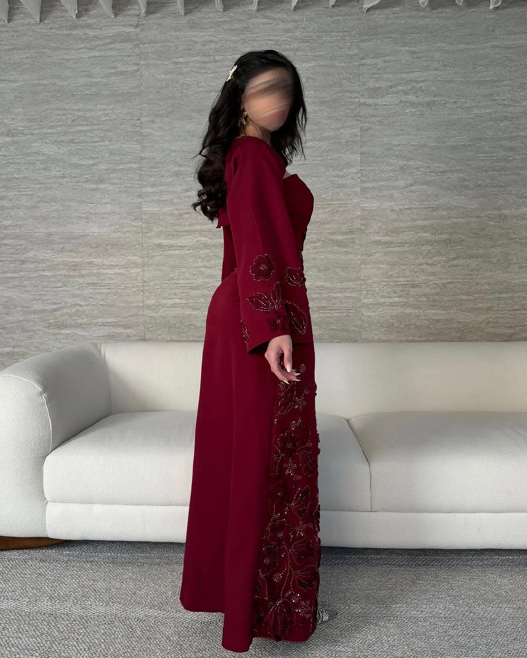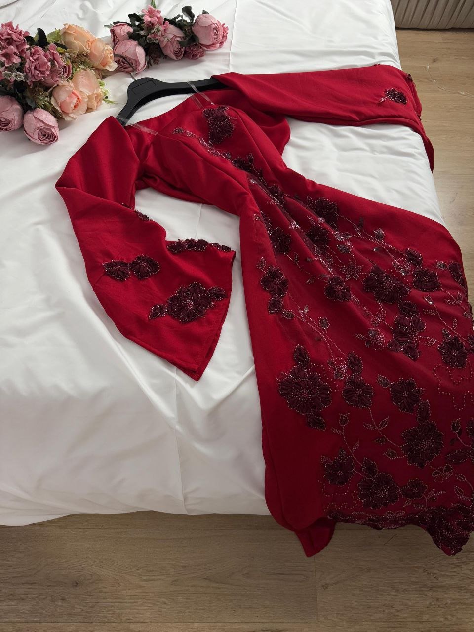 اللون البرغندي الفاخر يعكس عمق الأنوثة وأناقة التفاصيل، والتصميم الكلاسيكي يجمع بين البساطة والرقي، ليمنحك حضورًا لا يُنسى في أي حفل أو مناسبة رسمية.
