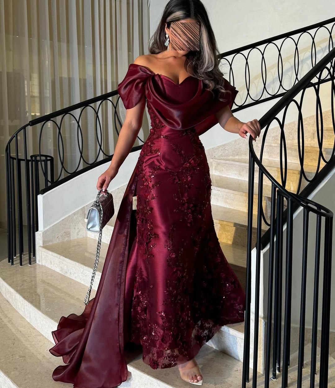 تصميم off-the-shoulder مع ذيل خلفي خفيف يمنحك إطلالة درامية راقية تناسب أمسياتك الخاصة