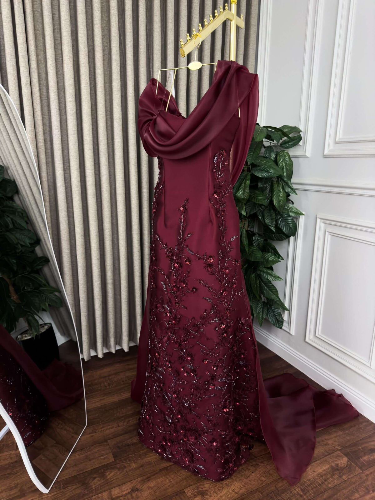 تألقي بفستان سهرة برغندي انسيابي رقيق من Cutecci يتميز بخامات شيفون ناعمة وخطوط مستقيمة تنساب بانسيابية على الجسم