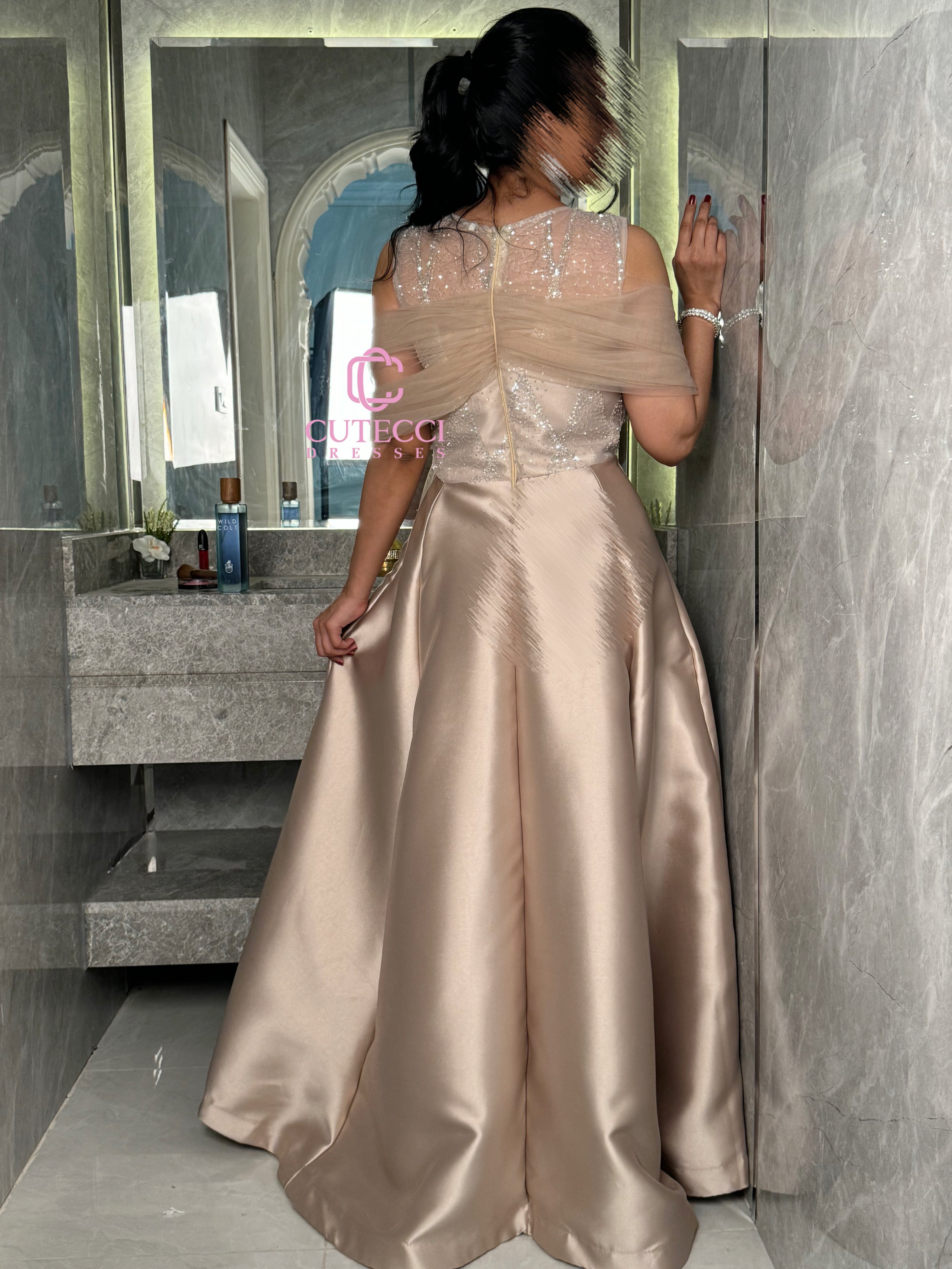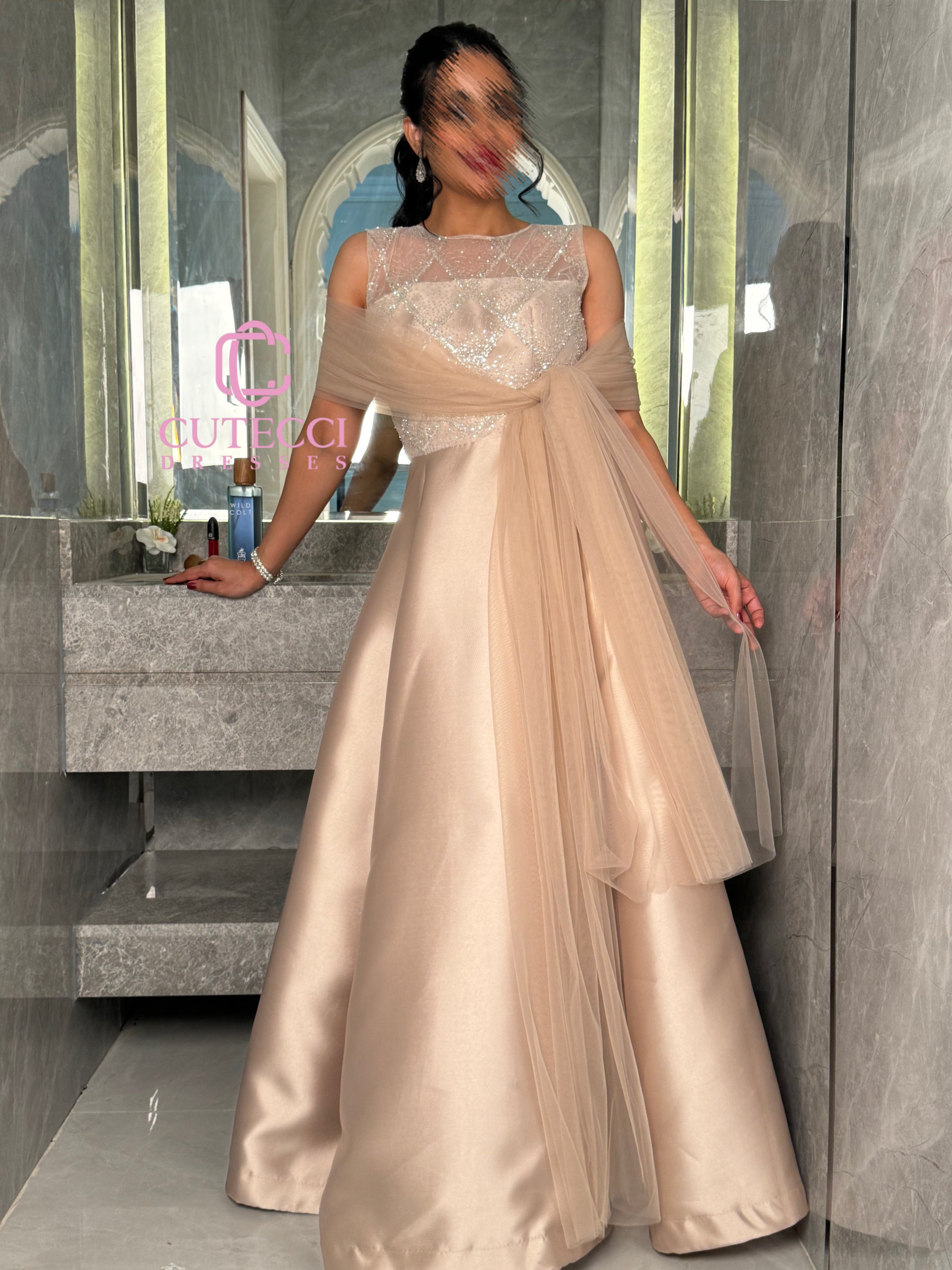 فستان سهرة بيج راقي بكتف شيفون بتطريز لؤلؤي ولمعة ناعمة، تصميم ملكي أنيق للمناسبات – اكتشفيه الآن في متجر Cutecci