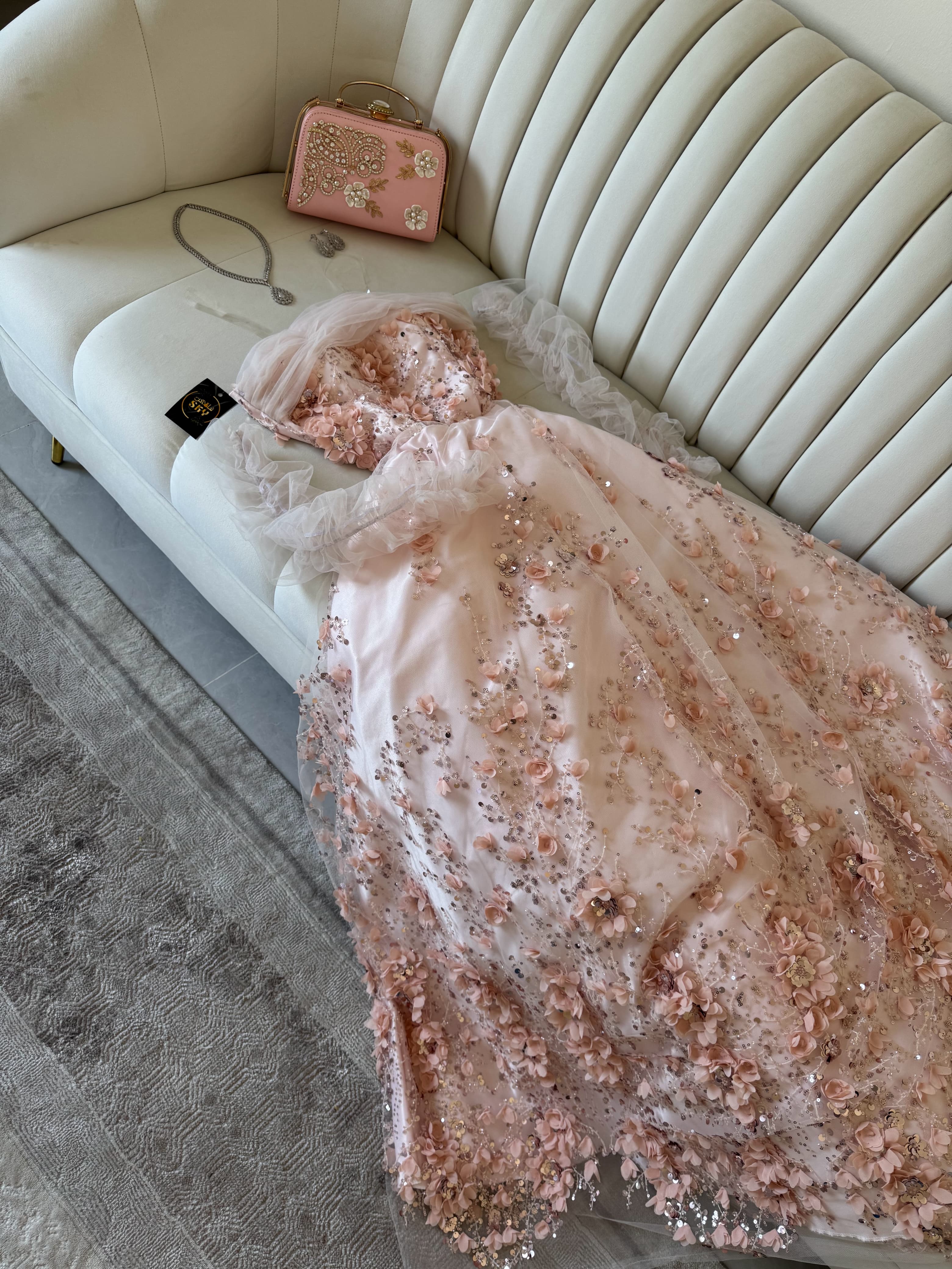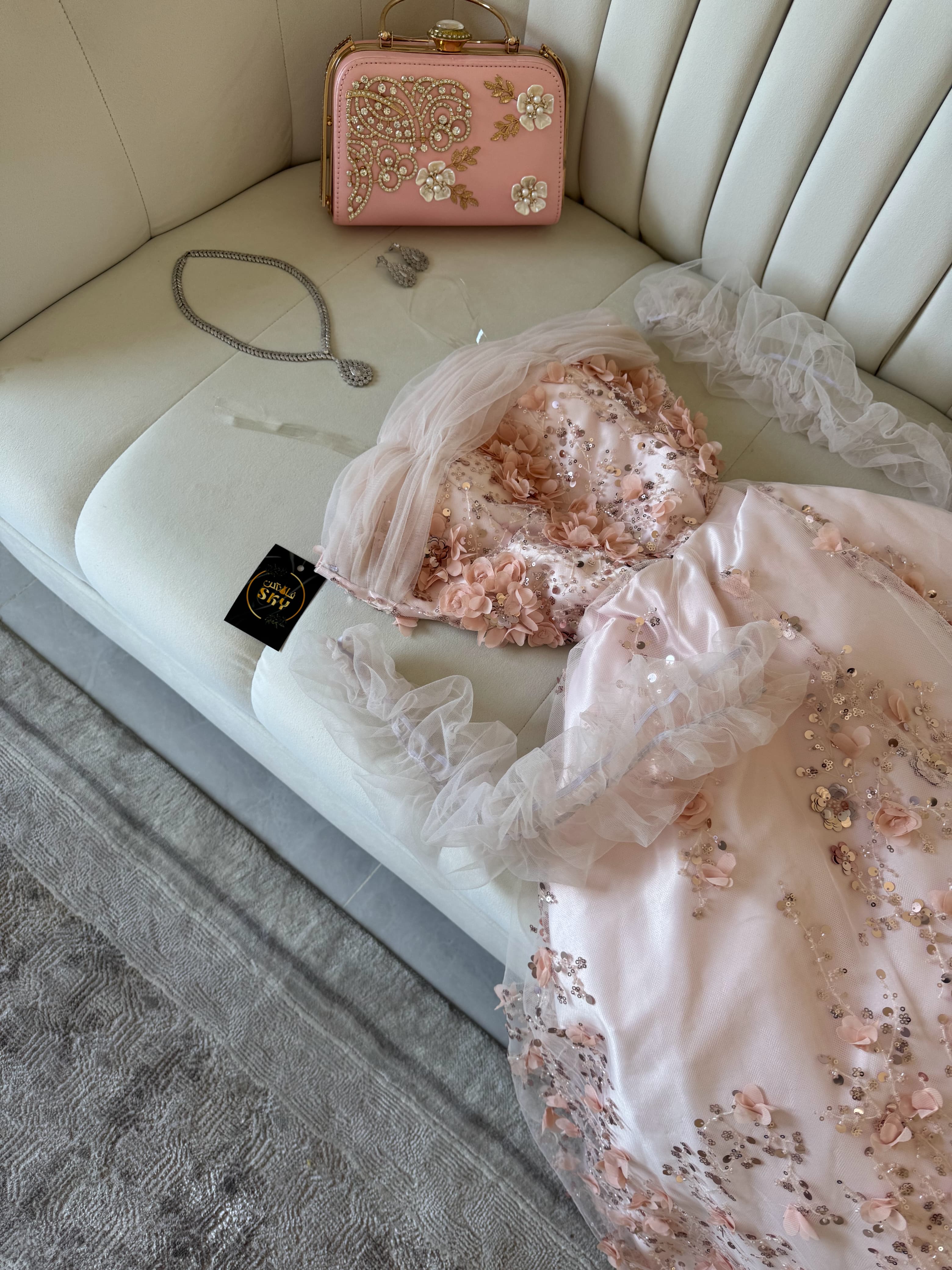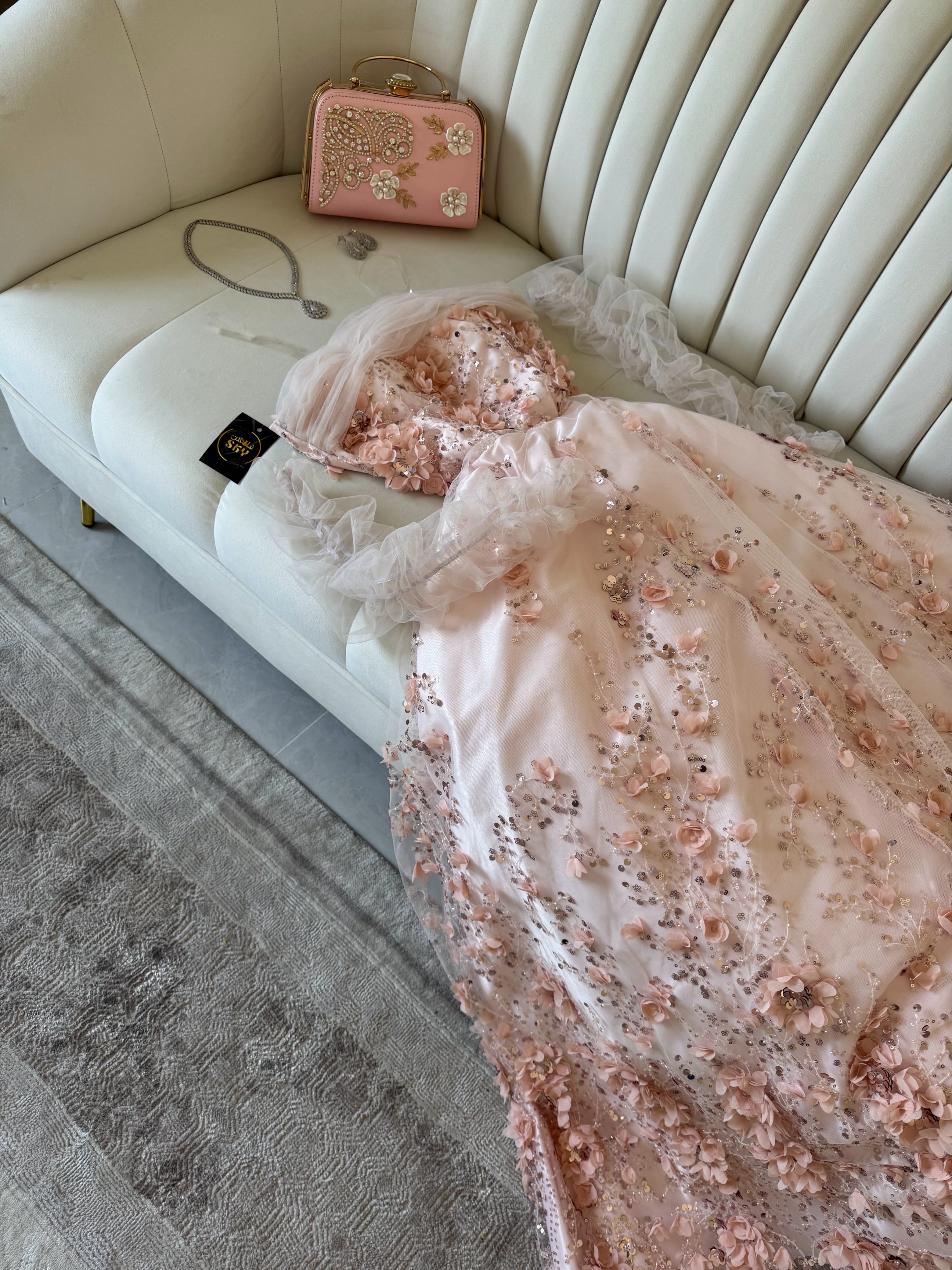 الفستان ناعم بقماش وردي فاتح يعطيك إطلالة ناعمة ورقيقة، والتطريز الوردي على كامل الفستان يميزه عن أي فستان ثاني. الزخرفة ثلاثية الأبعاد تعطي لمسة جمالية وكأن الزهور حقيقية، تناسب كل البنات اللي يحبون الفخامة مع البساطة.