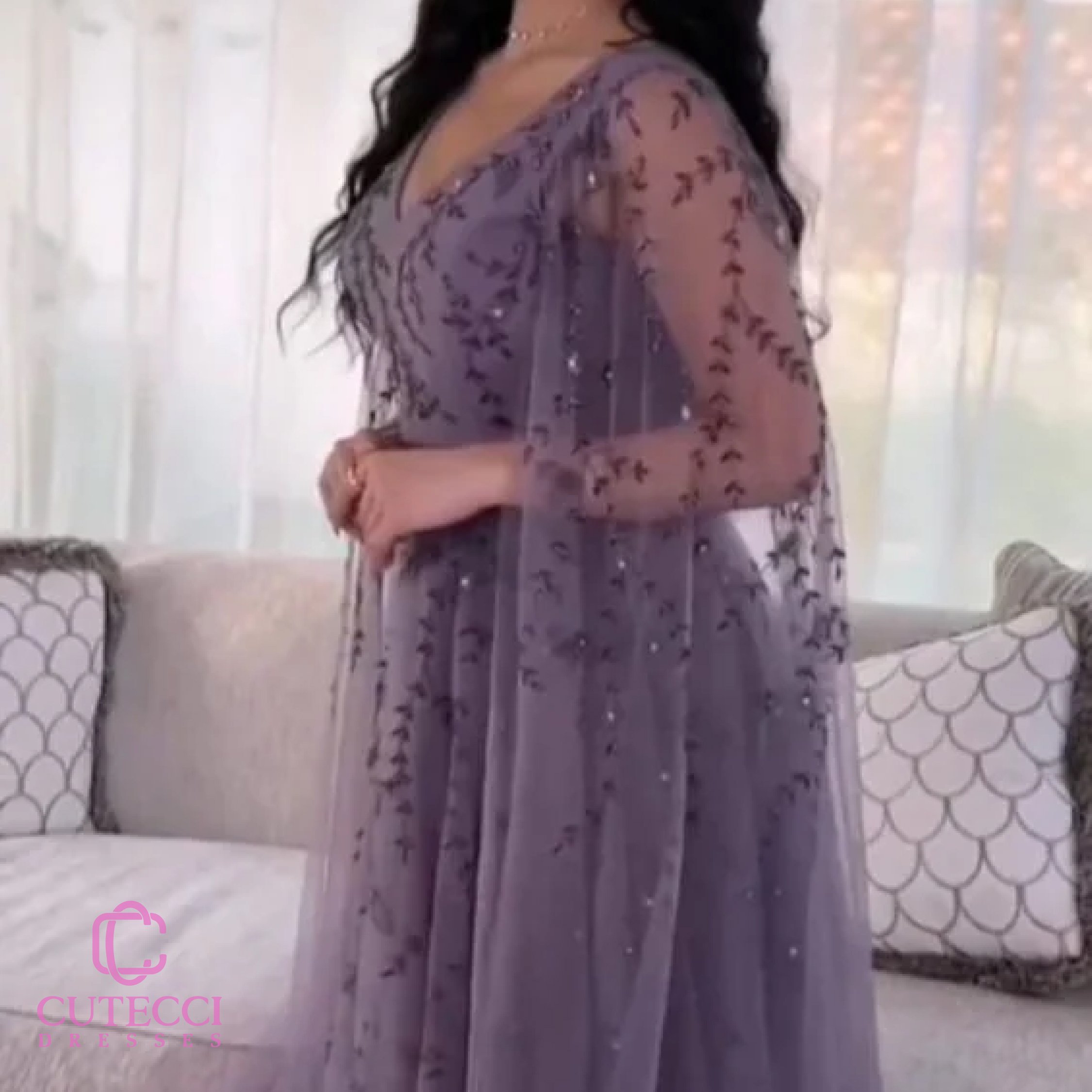 فستان سهرة شيفون بنفسجي مطرز بأناقة من كيوتشي بتصميم ملكي فاخر يناسب السهرات، حفلات الخطوبة والزفاف.