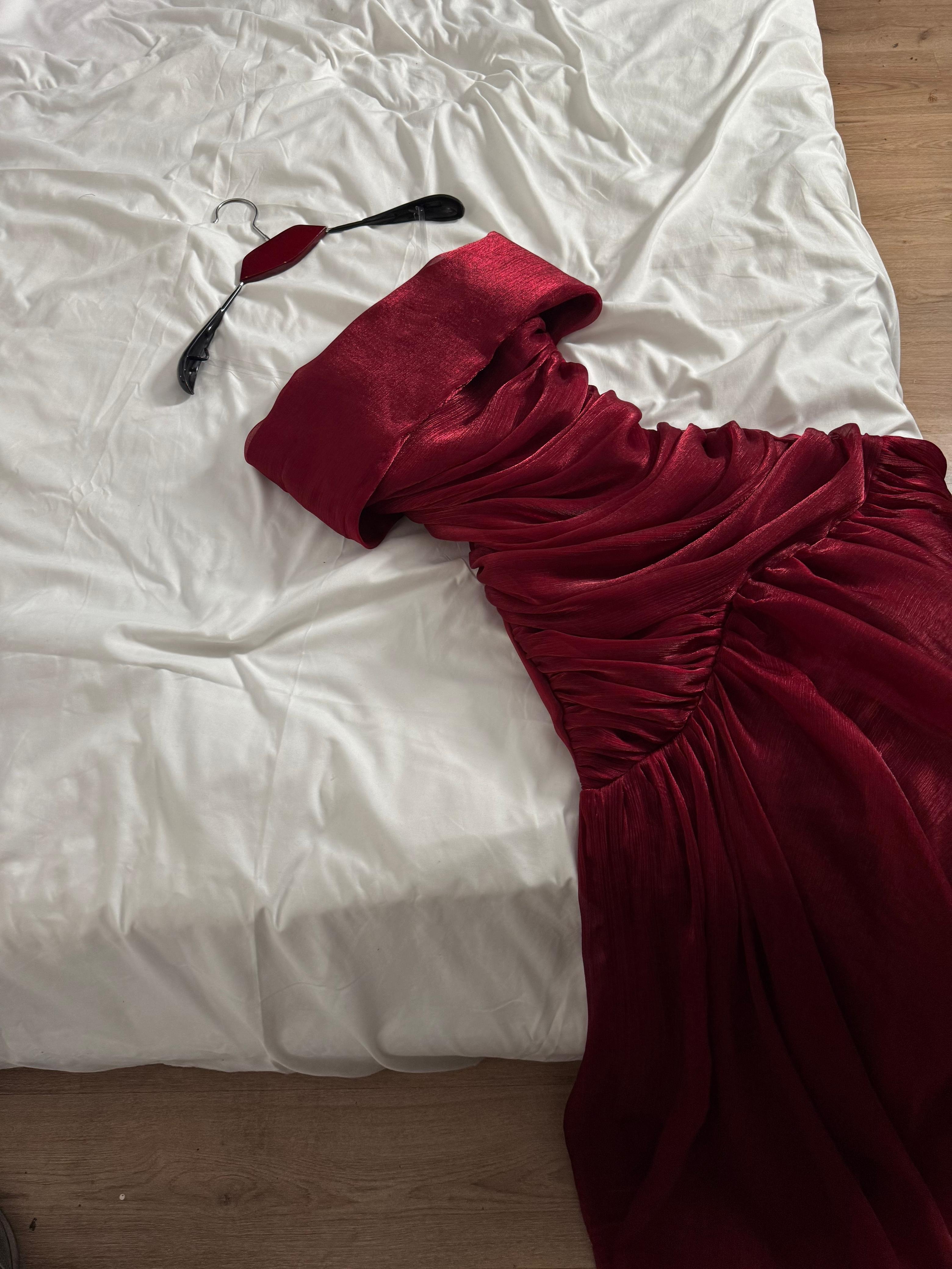 - اللون والقماش: يأتي بلون عنّابي ساحر يرمز للعشق والفخامة، مصنوع من خامة كرنكل فاخرة بلمعة خفيفة تمنحك حضورًا راقيًا وأنثويًا.