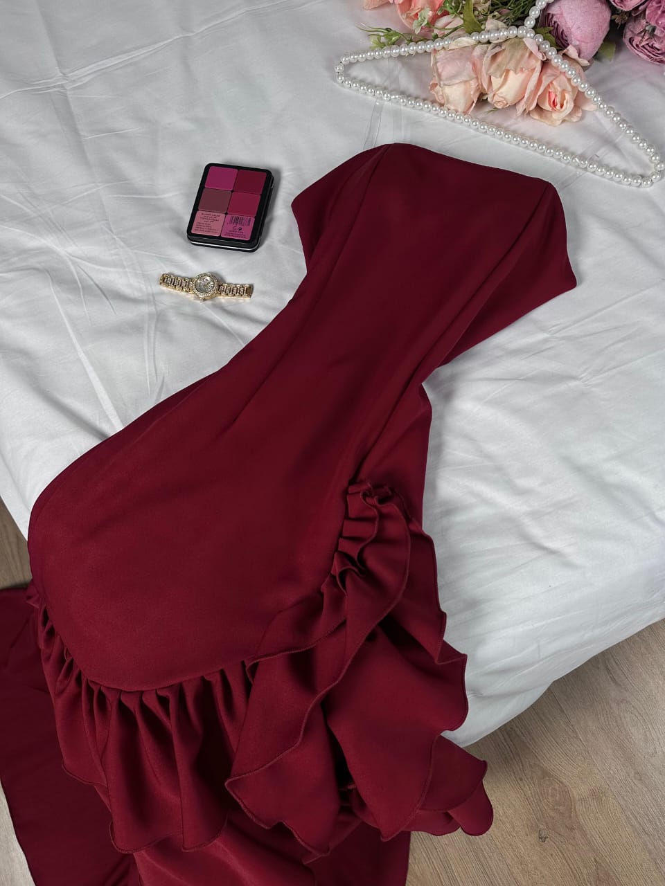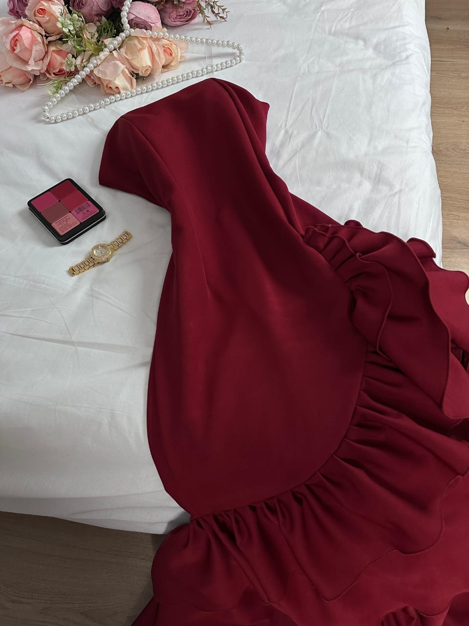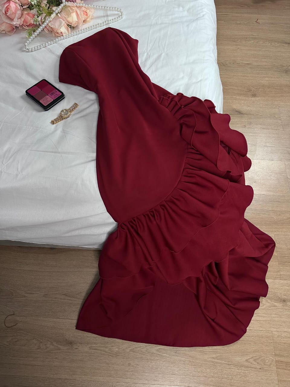 - الزينة والتطريز: يتميز بكشكش بارز كنقطة محورية، بدون تطريز إضافي مما يجعل التركيز على القصة والبناء الفخم.