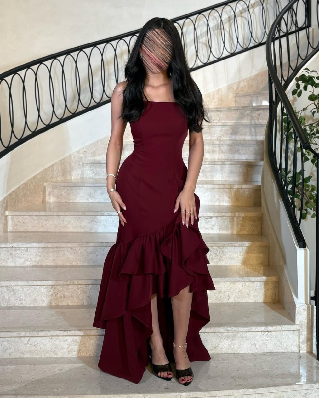 فستان سهرة فخم بقصة High-Low بتفاصيل كشكش أنيقة تمنحك إطلالة درامية ومميزة. اللون العودي الساحر يعكس الذوق الراقي ويبرز حضورك في المناسبات المهمة.