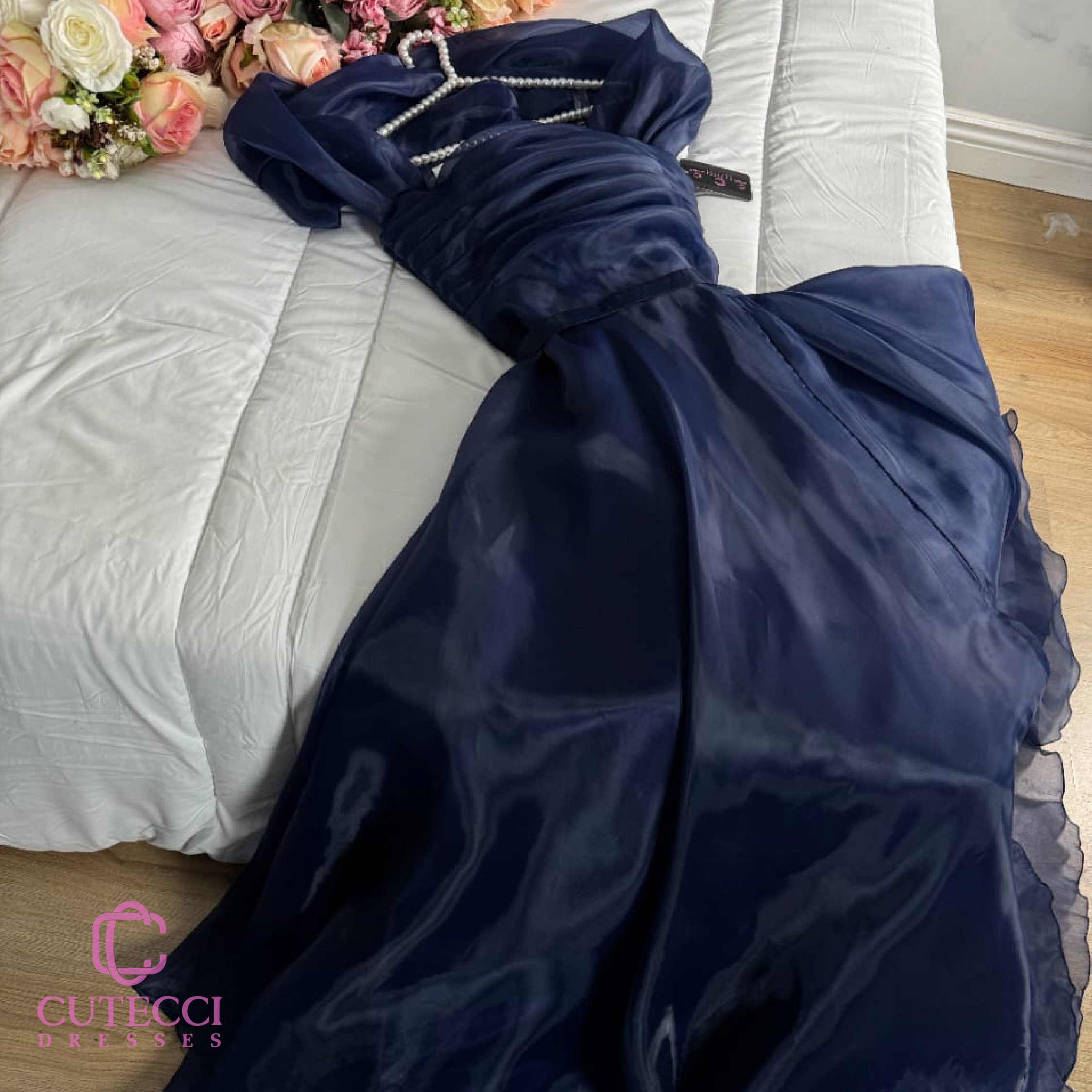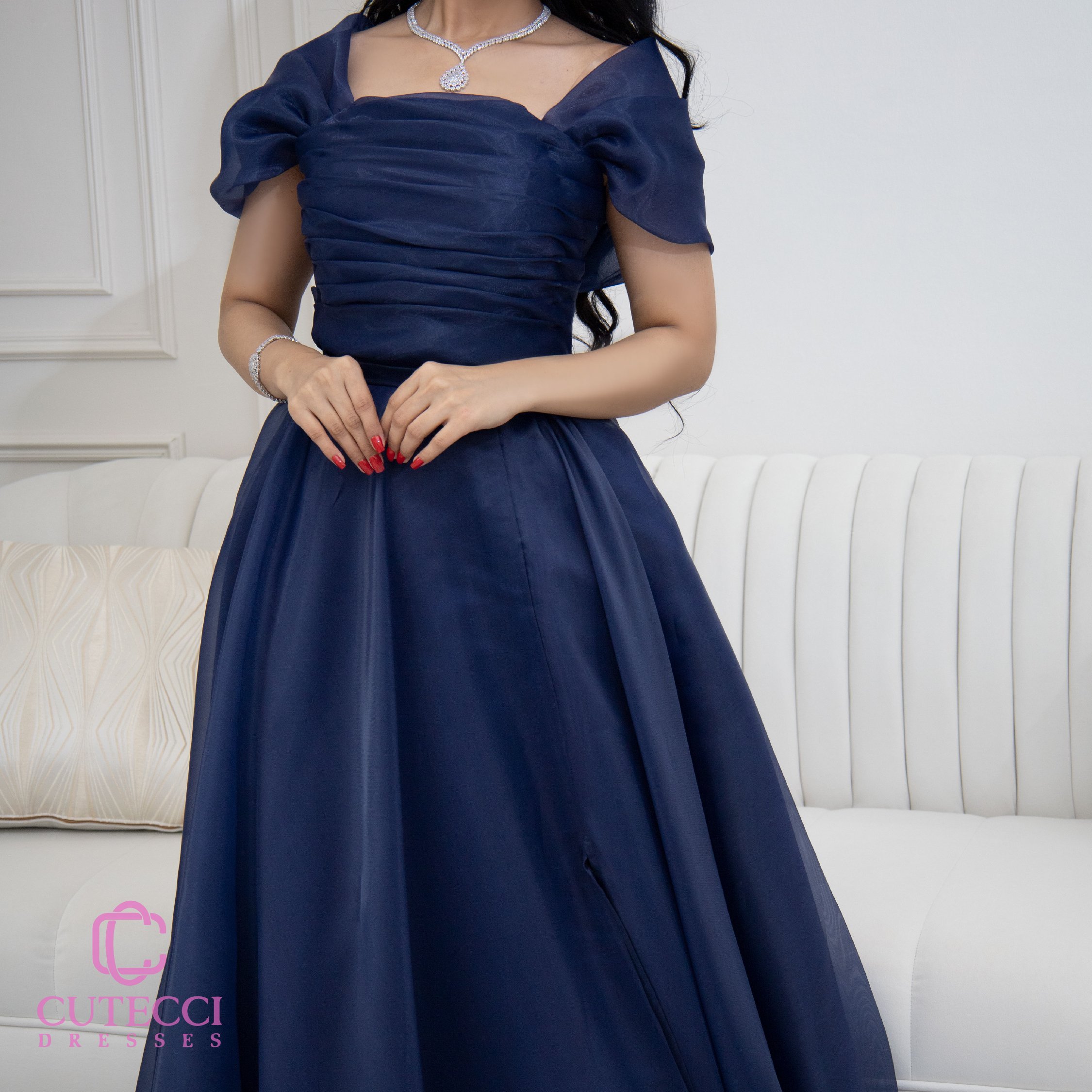 اختاري إطلالتك الفخمة مع موديل لا مثيل له! فستان سهرة كحلي من قماش الجزار الفاخر بتصميم دبل كلوش واسع يمنحك حضور هادي وراقي ما تقدرين تلقينه إلا في كيوتشي، الماركة السعودية المتخصصة في أزياء الحفلات والمناسبات الفخمة.
