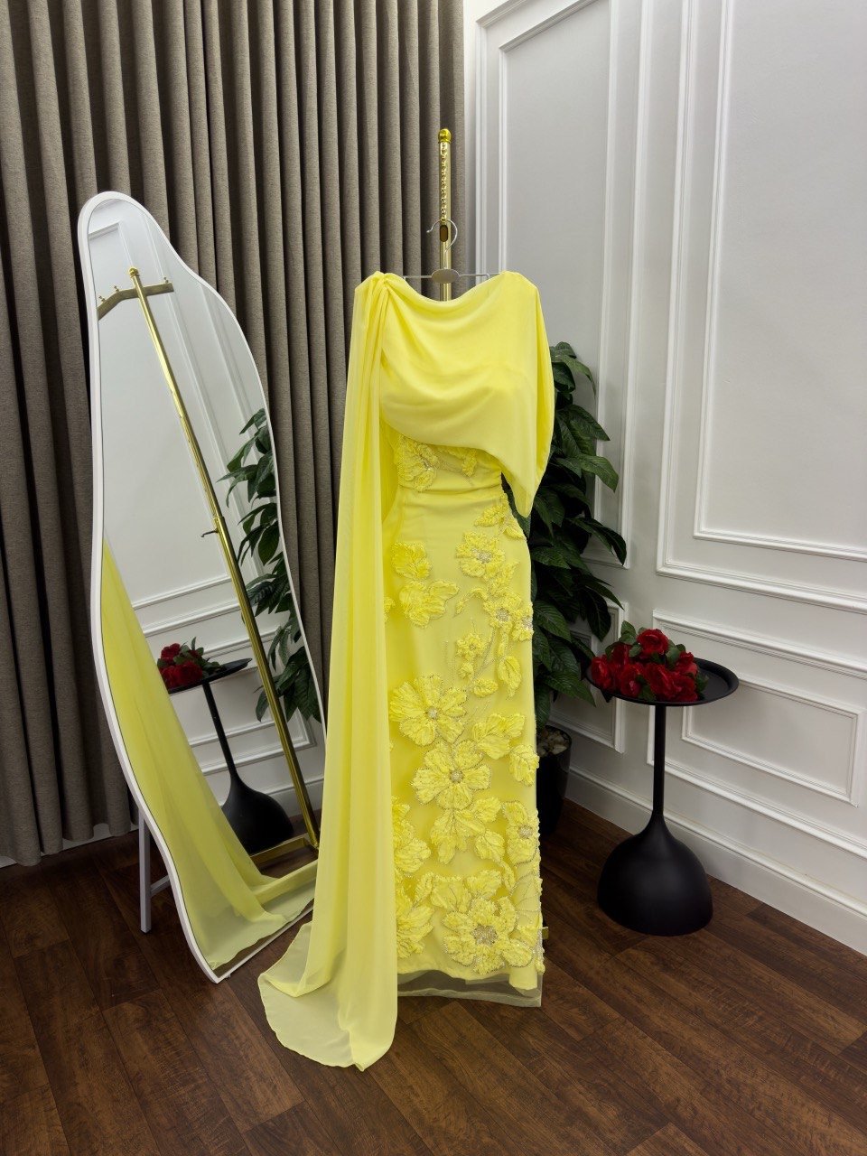 فستان سهرة ليموني ملكي مزين بالزهور يضفي عليكِ إشراقة فاخرة وأناقة لا مثيل لها.