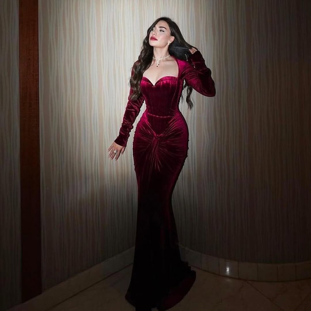 قصّة فخمة تبرز منحنيات الجسم بأناقة، قماش مخمل ناعم ومخملي، مثالي لسهرات الزفاف والمناسبات الراقية،