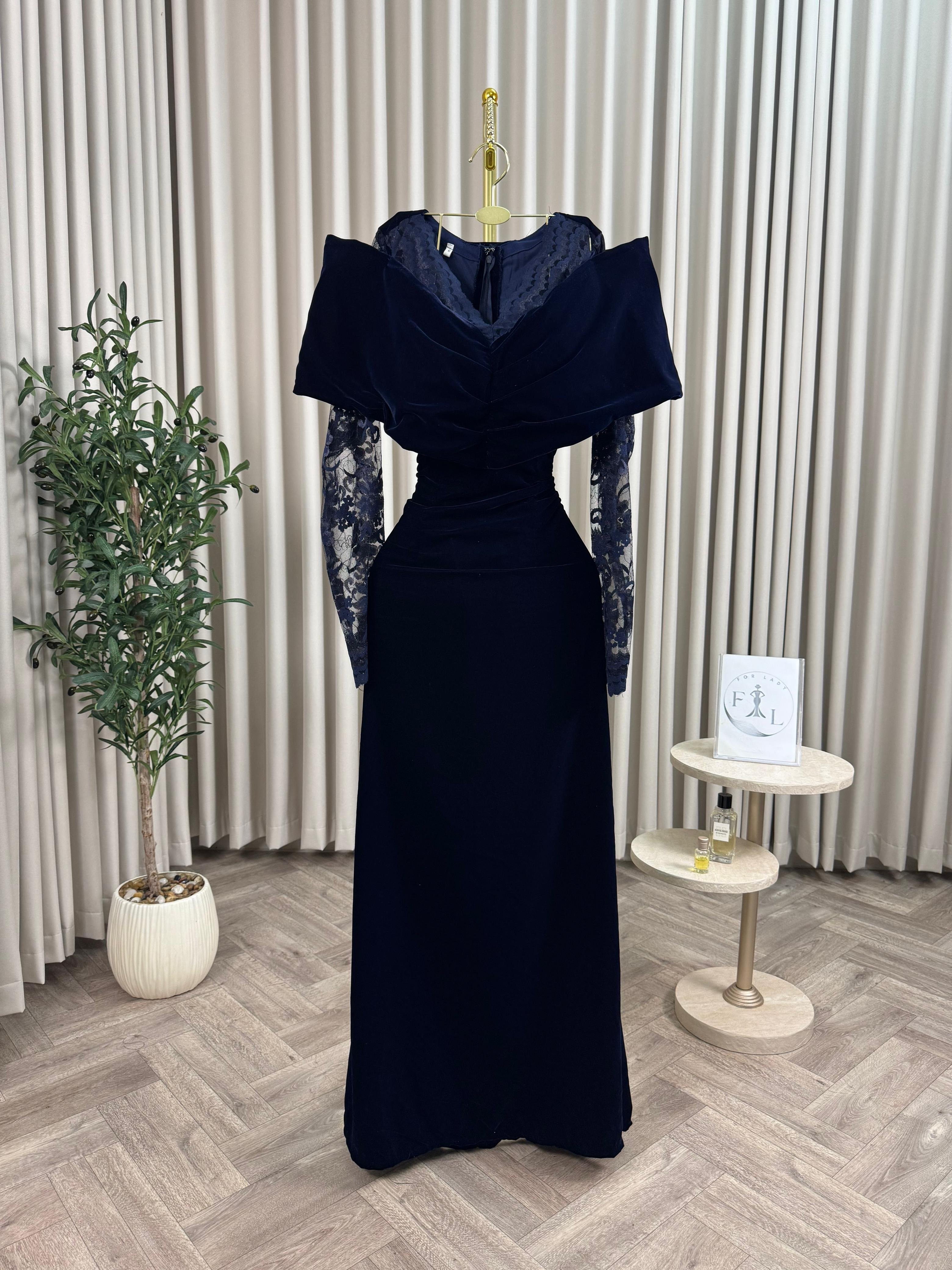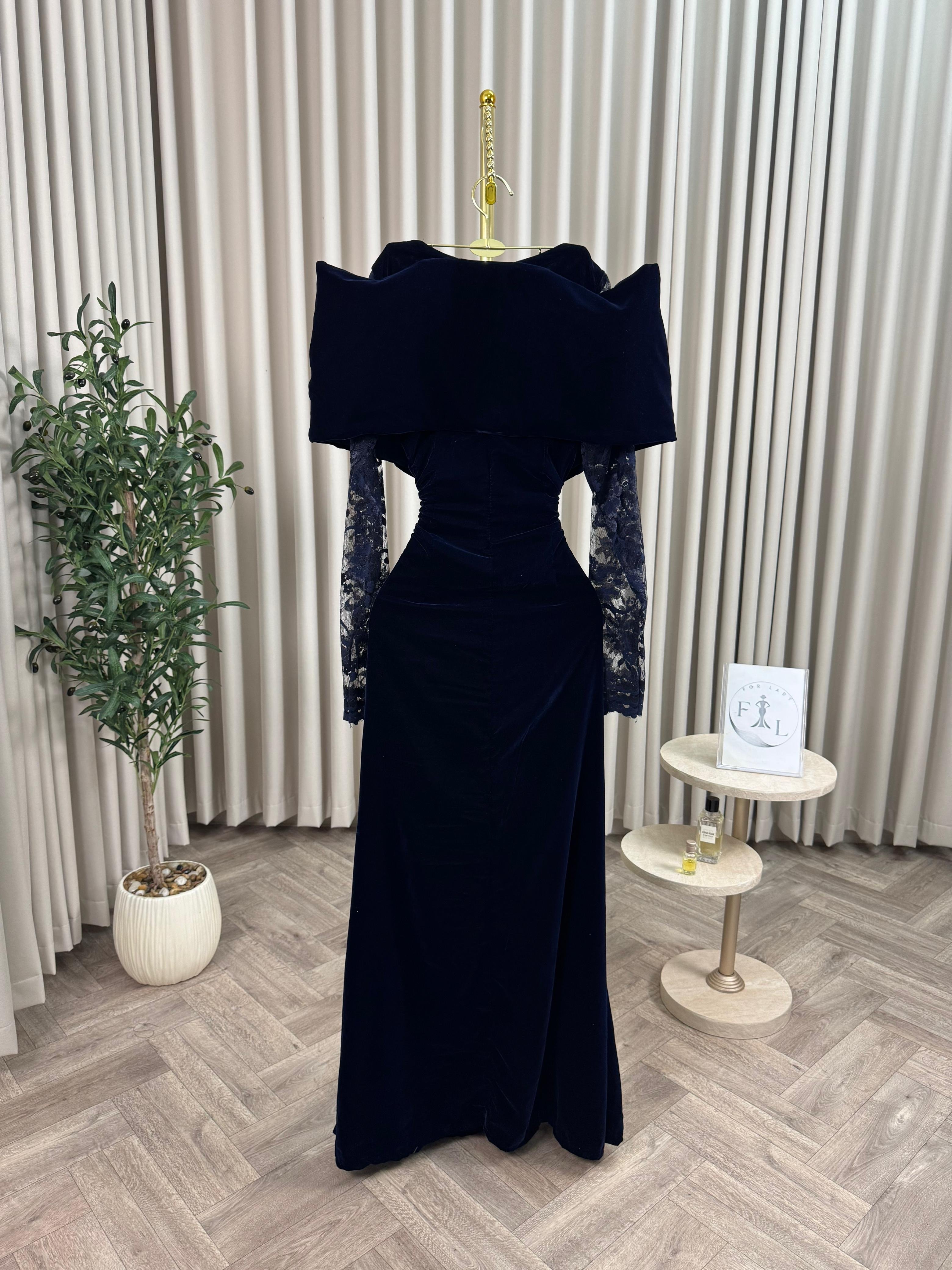 فستان سهرة مخمل كحلي بأكمام دانتيل فاخرة