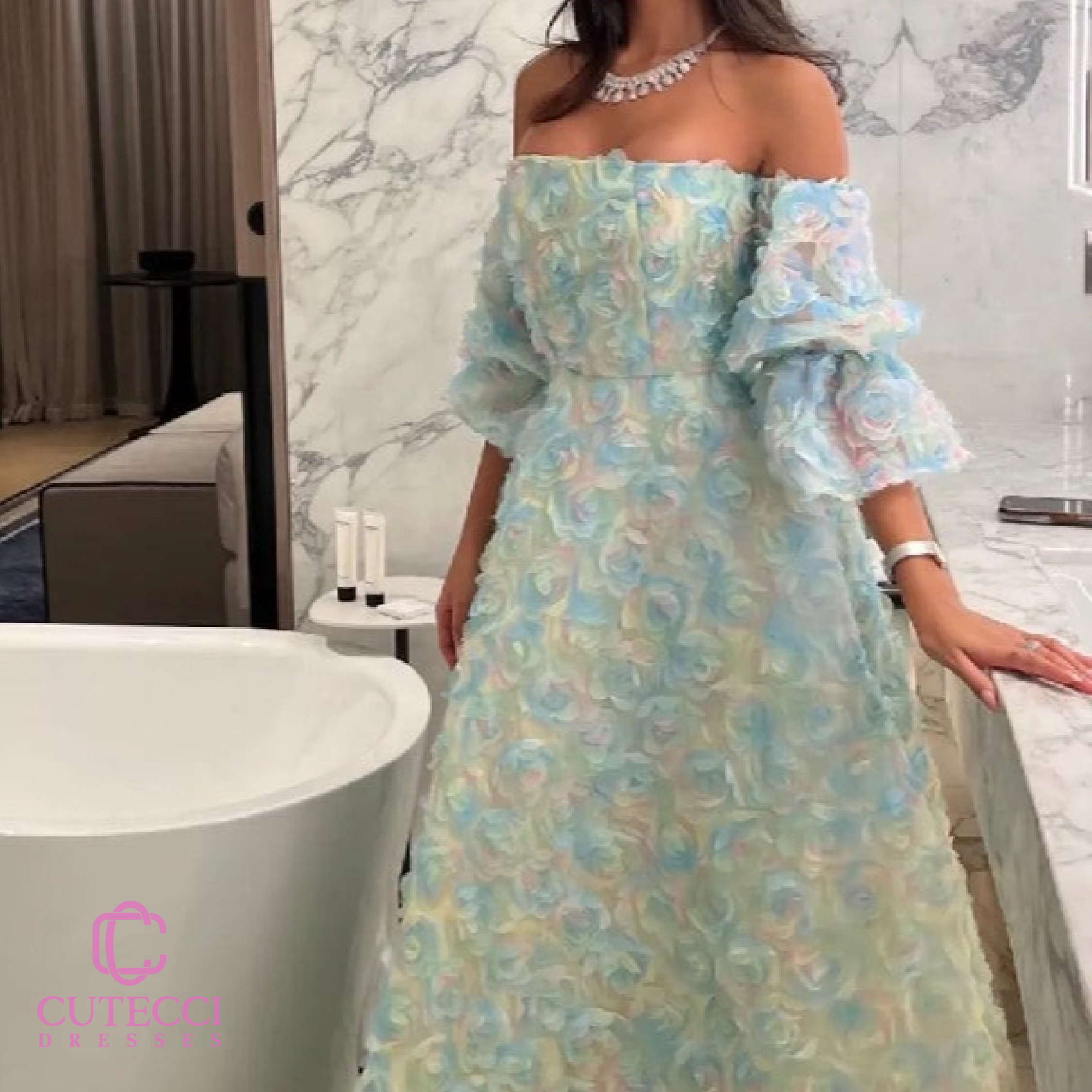 فستان سواريه مطرز بألوان ناعمة مع نقوش ورود بارزة فاخرة يناسب السهرات، الخطوبة، وحفلات الزفاف والمناسبات الراقية.