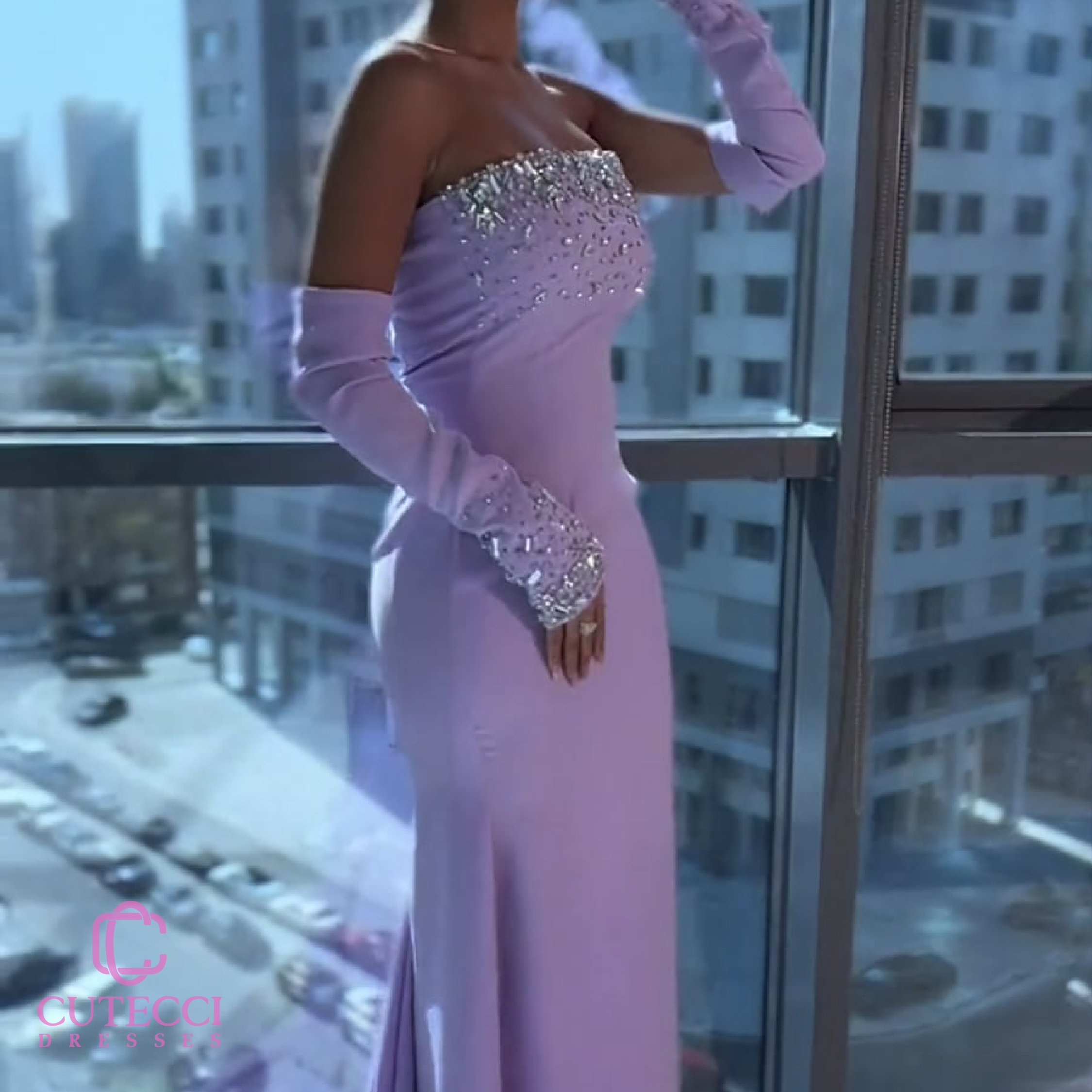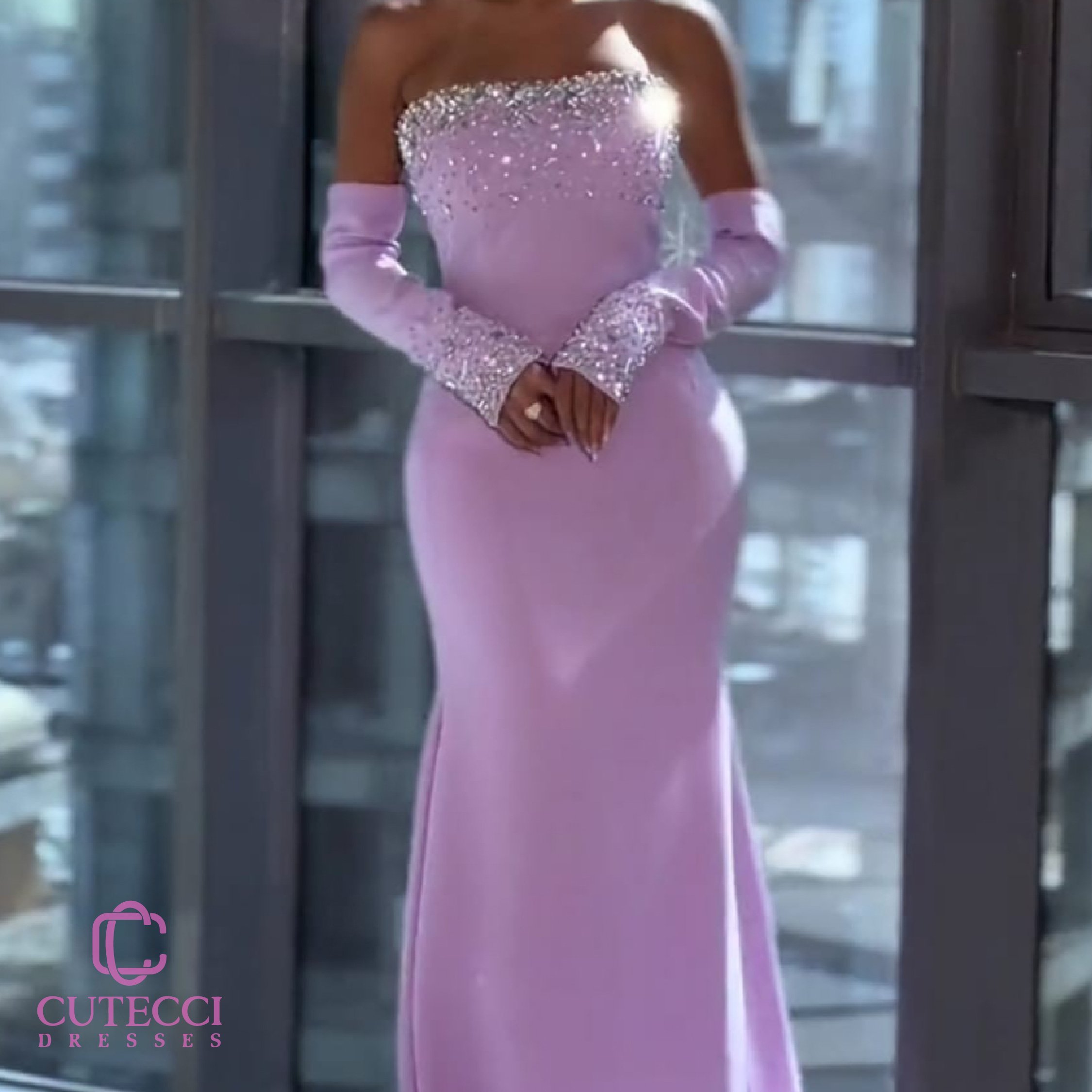 - الزينة والتطريز: مطرز يدويًا بخرز لامع وكريستالات فاخرة عند الصدر والأكمام لمظهر يخطف الأنظار.