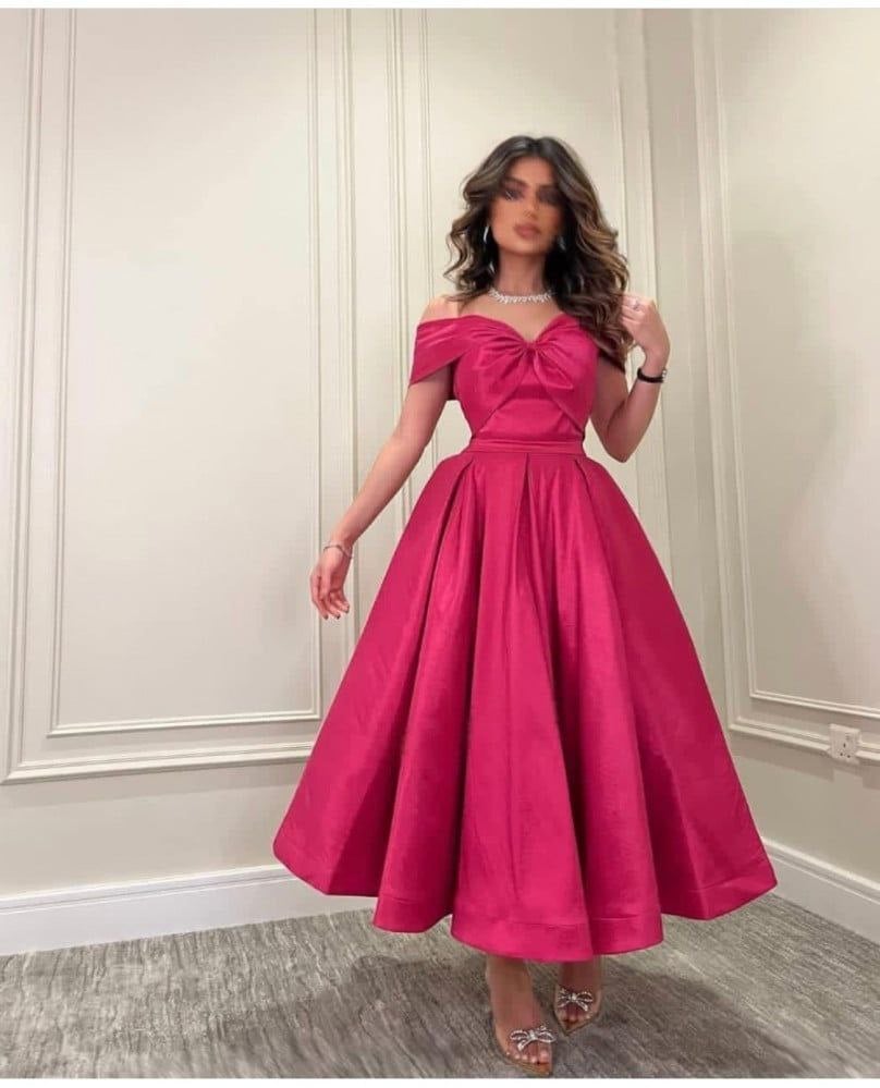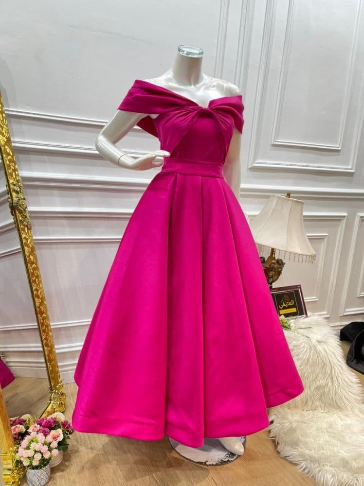 فستان فوشيا بطول ميدي، قصّته المكشكشة وكتفه المكشوف يمنحانك لمسة عصرية مميزة، مثالي لحفلات المساء والمناسبات الخاصة.