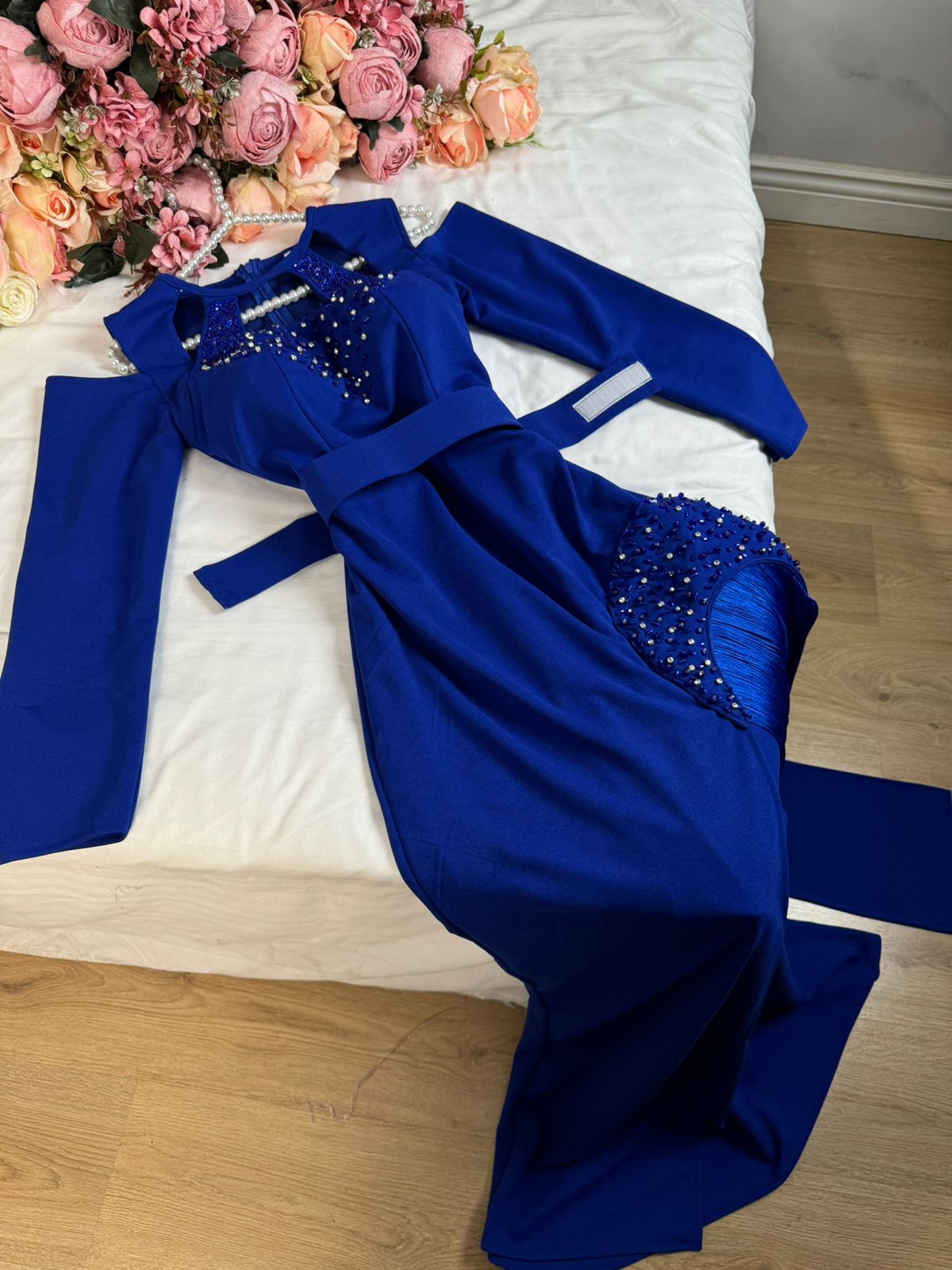 - الزينة والتطريز: تطريز يدوي فاخر بالخرز اللامع على الصدر والهدب الجانبي.