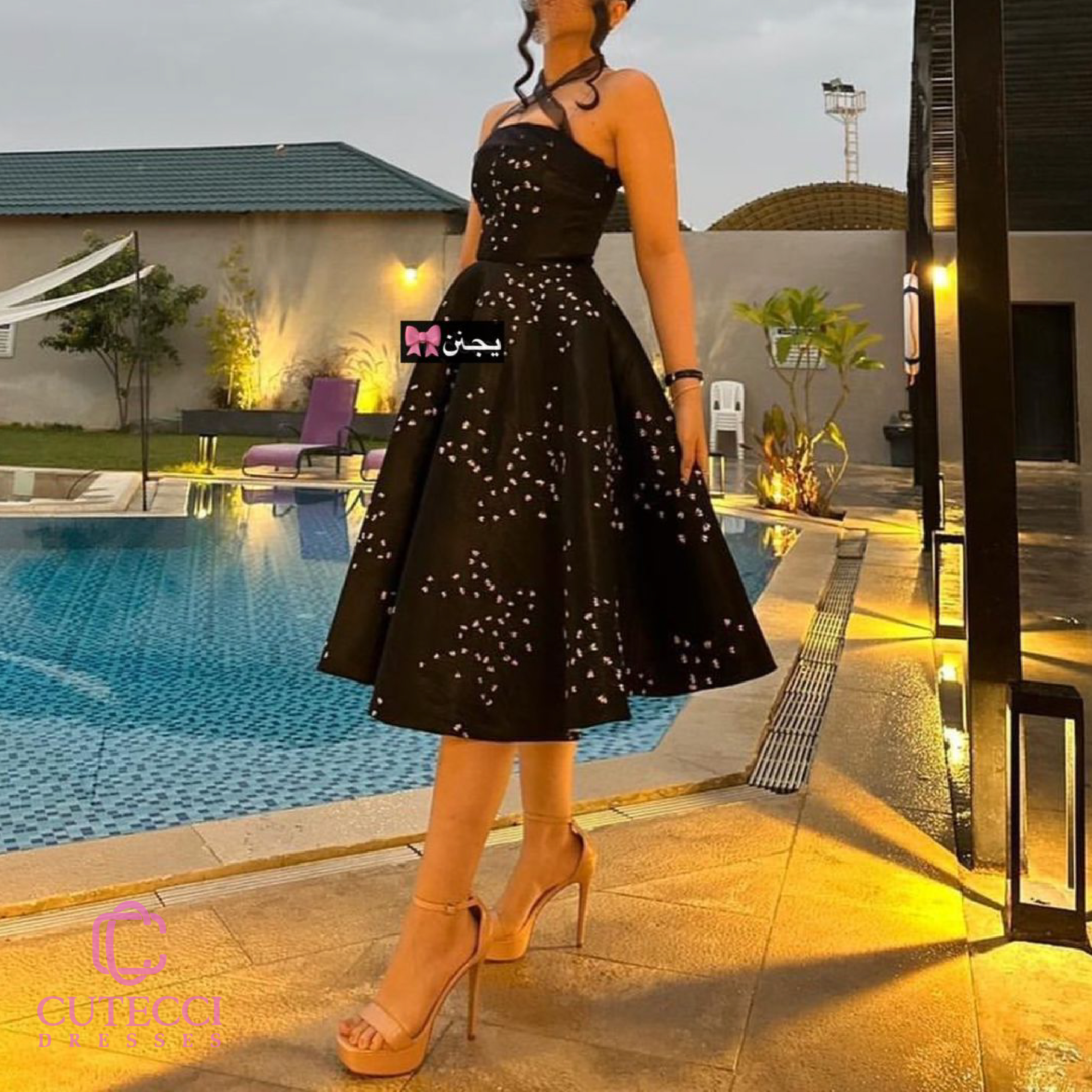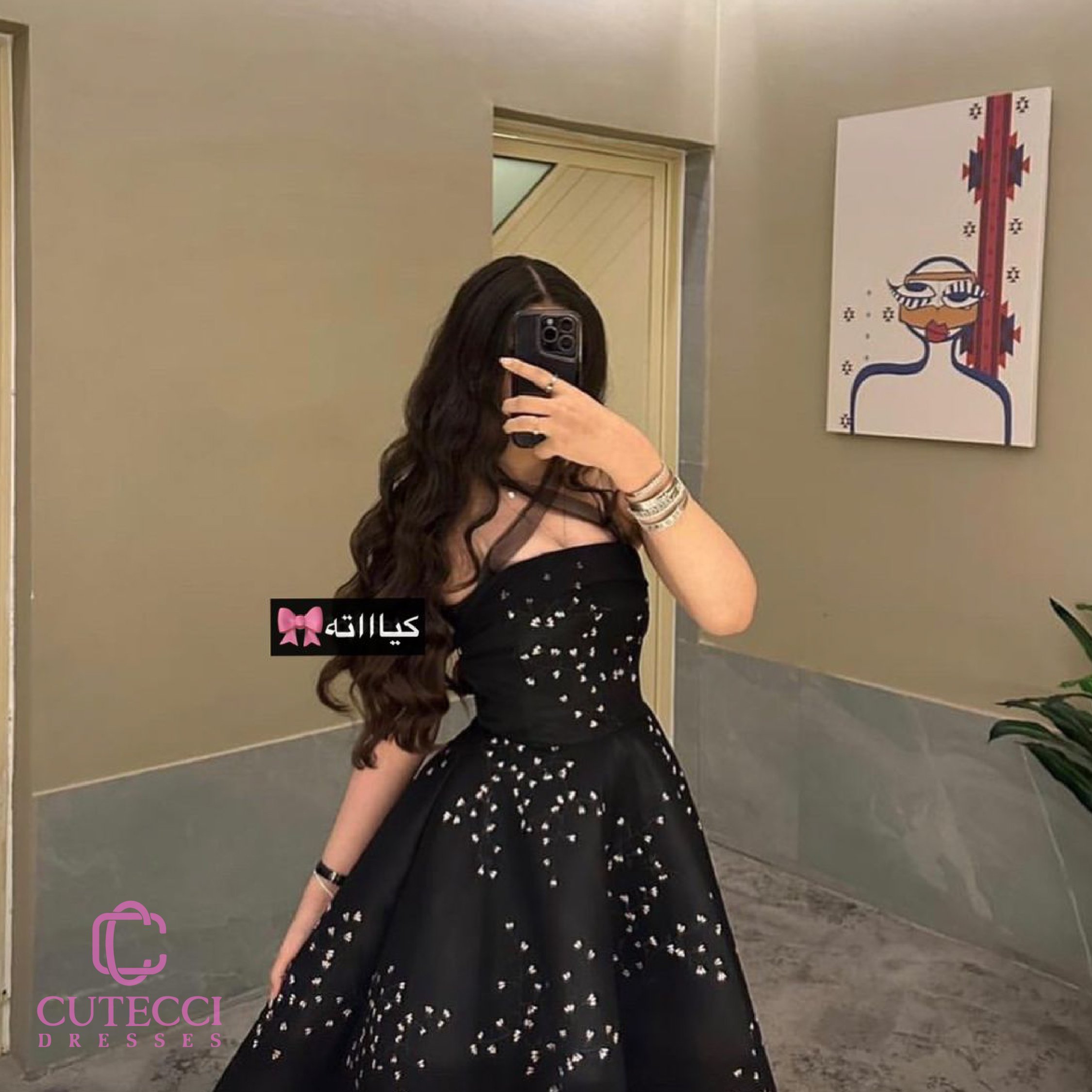 فستان سهرة قصير باللون الأسود الفاخر مع تطريز مشجر دقيق، تصميم ساحر يليق بأجواء الخطوبة، السهرات، والحفلات الراقية.