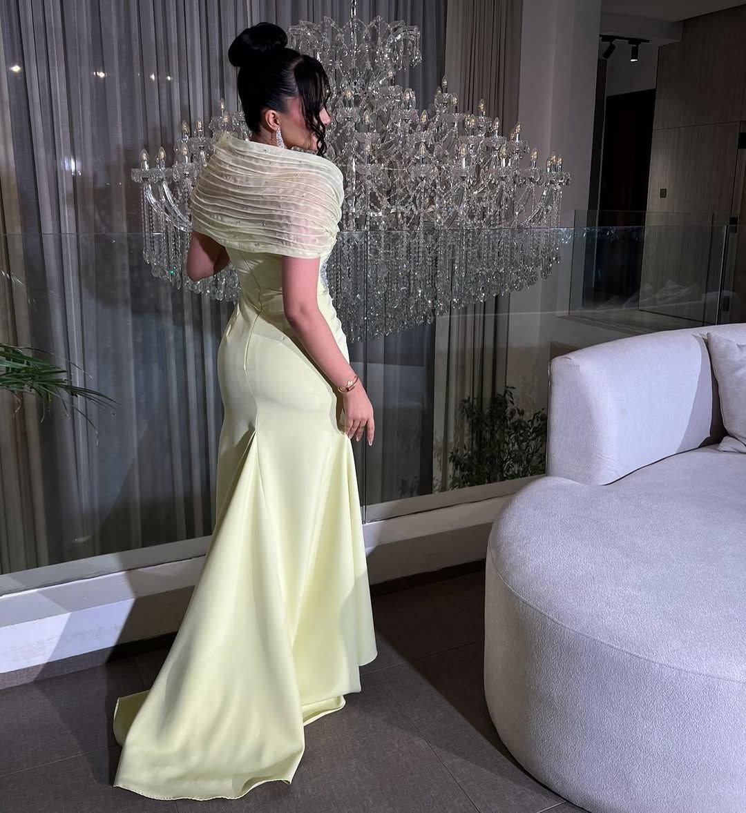 يمنحك هذا الفستان السلسلوني إطلالة ملكية بلمسة عصرية، مع شال مرفوع ملفوف بدقة وأكتاف مكشوفة تضفي رونقاً لا يقاوم.