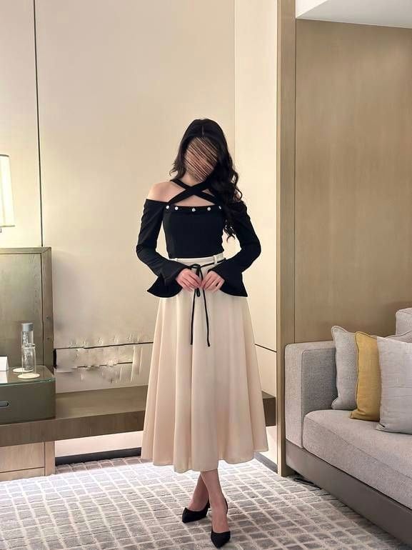 - اللون والقماش: يتكون من تنورة بلون بيج سكري ناعم وقميص أسود، مع خامة ساتان ناعمة ومرنة تمنح راحة وأناقة في آن واحد.