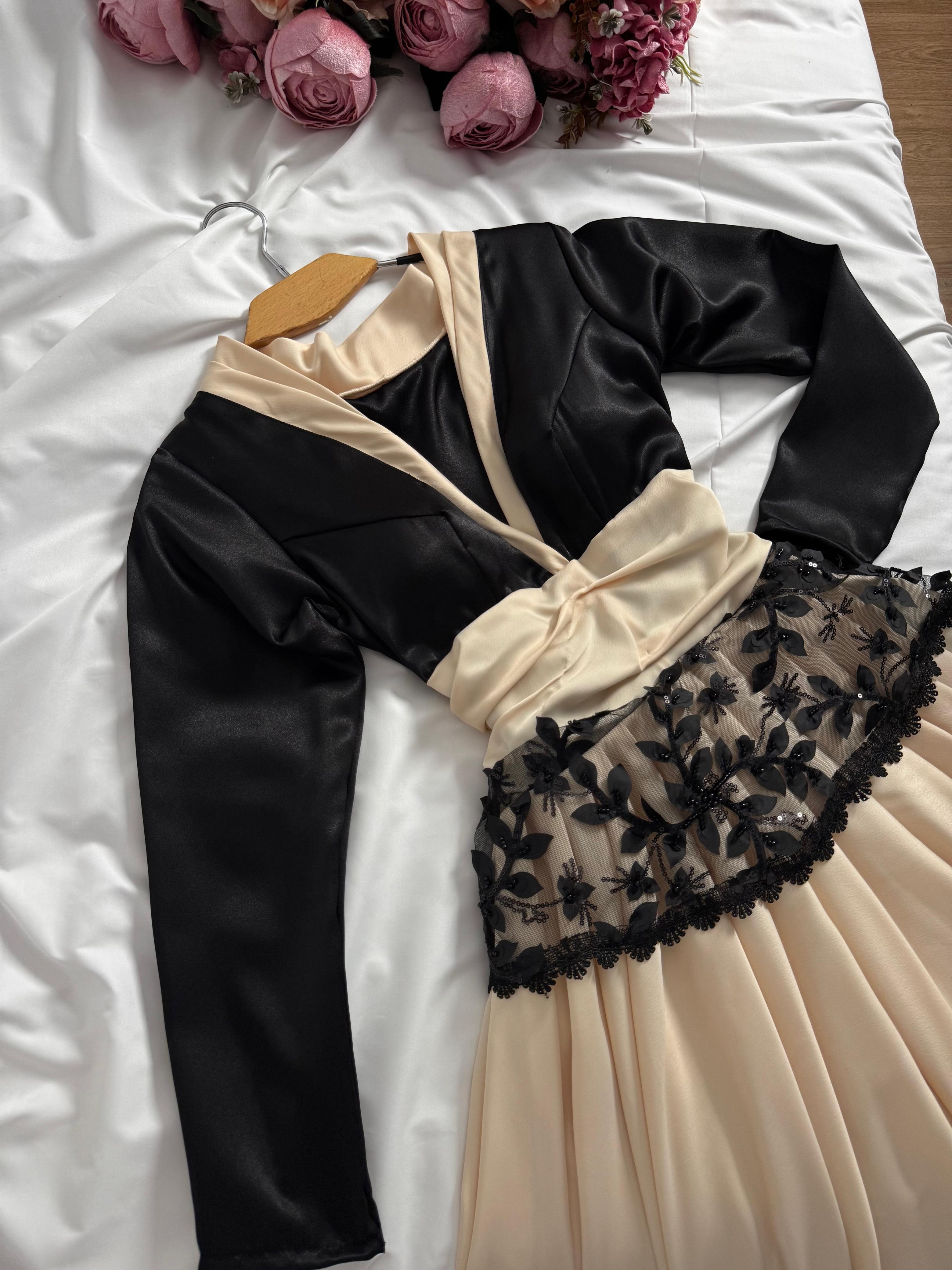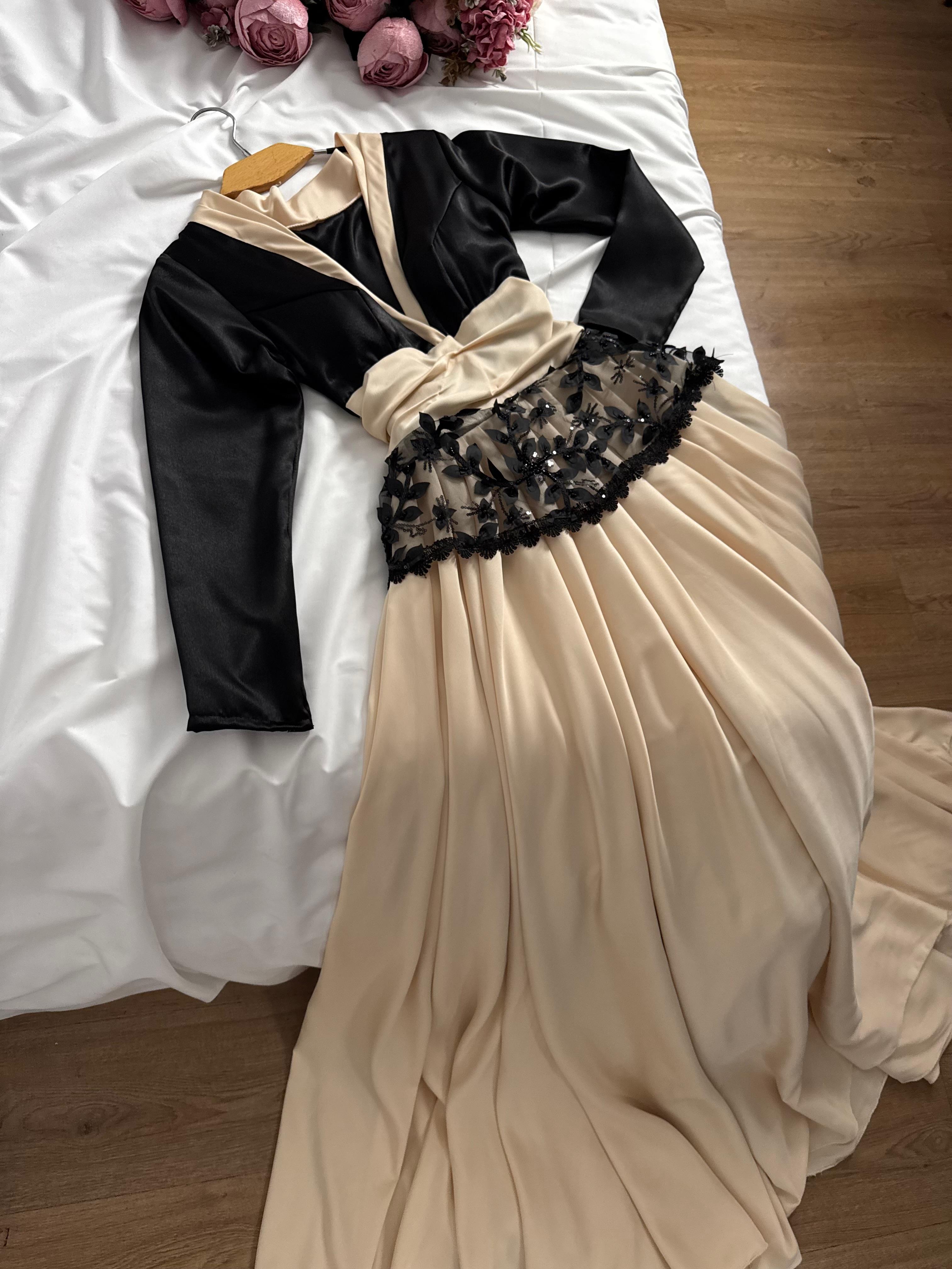 - اللون والقماش: توب أسود من ستان لامع وياقة وخصر بيج من ساتان وشيفون شفاف