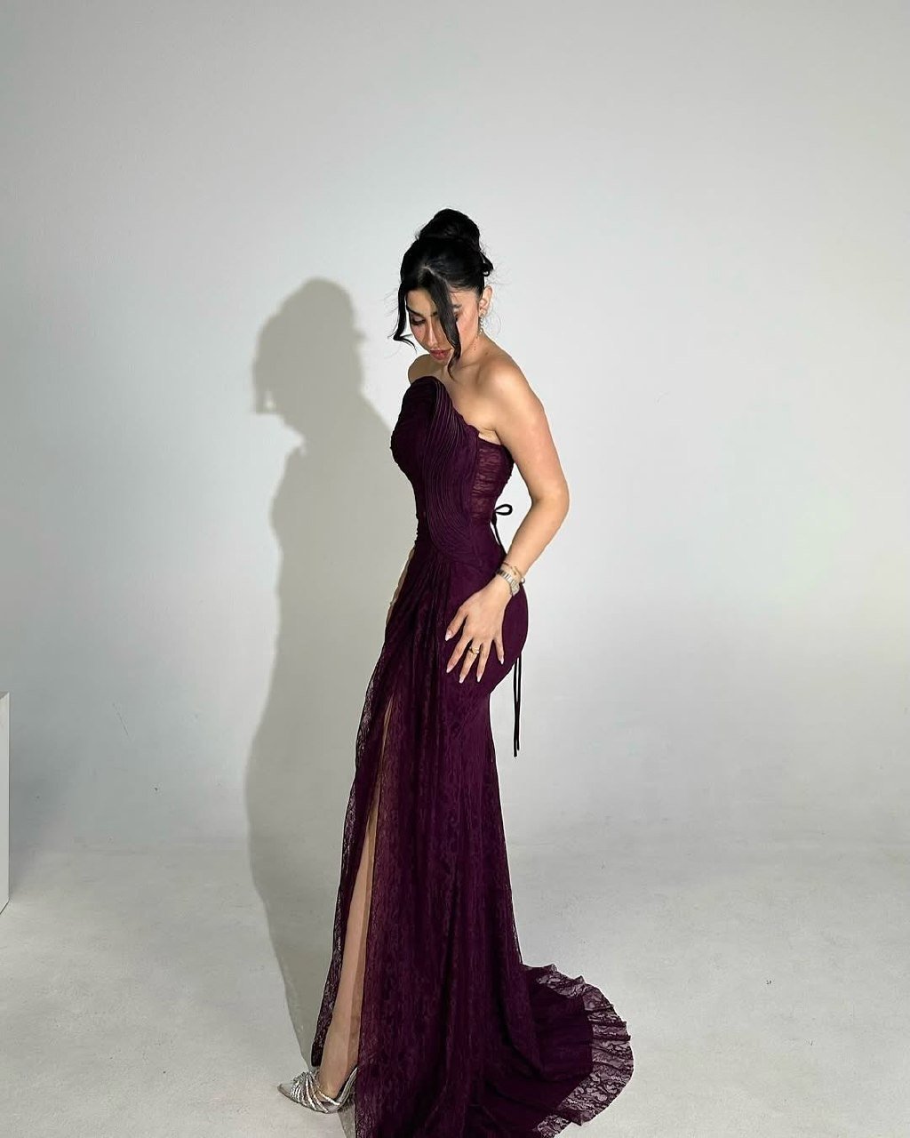 - القصّة: صدر مربّع مدعّم – خصر محدّد – أكتاف مكشوفة – تنورة طويلة دانتيل شفافة فوق بطانة مطابقة