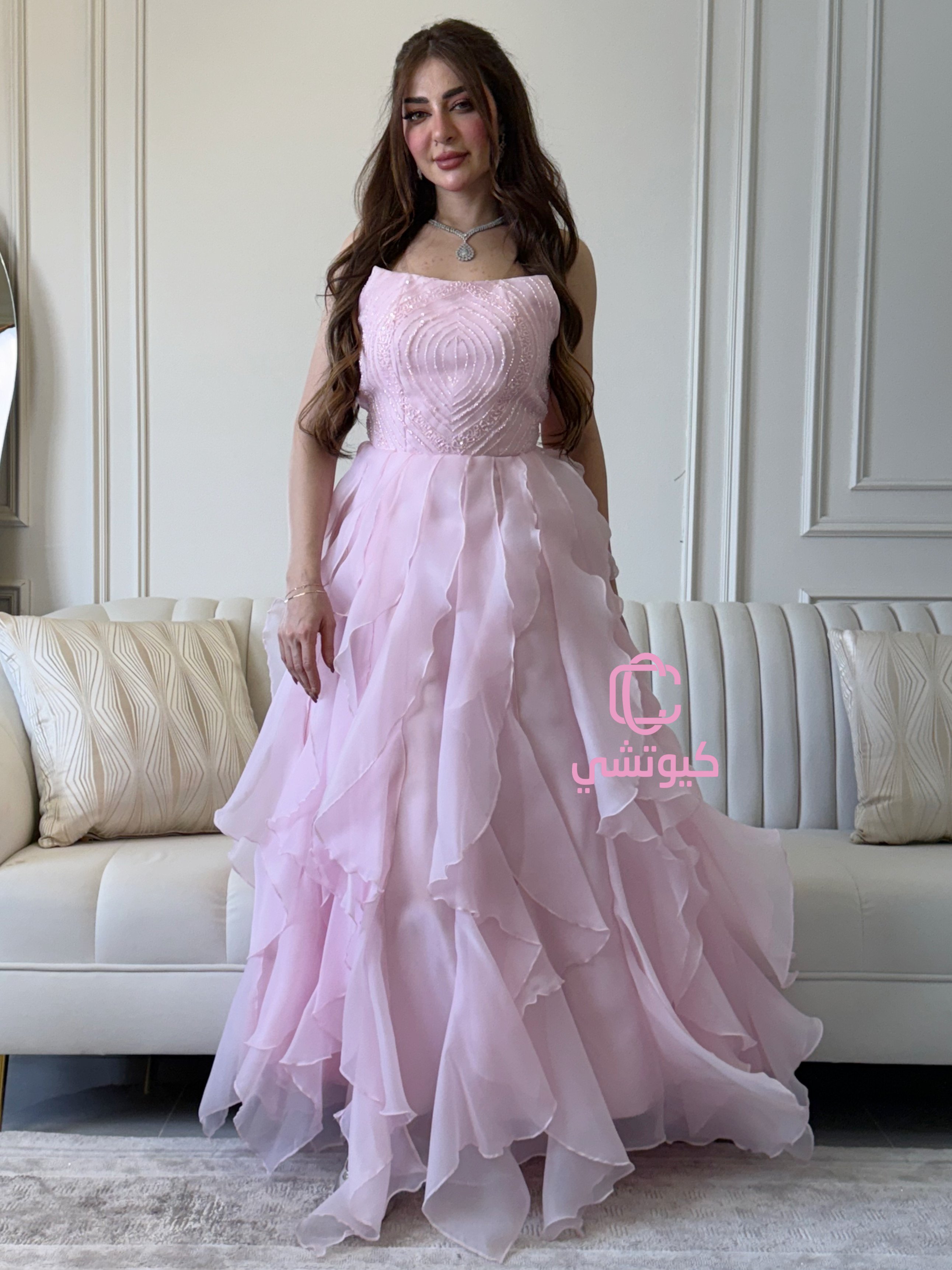 فستان سهرة بطبقات شيفون لحمي ناعمة، وقصة جذابة بدون أكمام تبرز الأنوثة، مثالي لمناسبات الخطوبة أو السهرات الراقية، تصميم أنيق ومتجدد يضفي عليكِ حضورًا لافتًا في كل لحظة.
