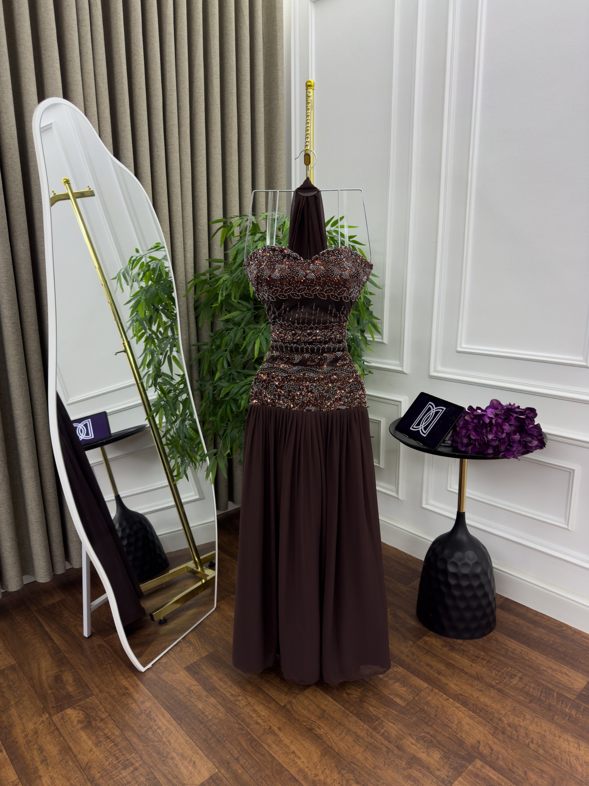 فستان مناسبات بني ملكي بلمعة جذابة من Cutecci، بتصميم راقٍ وتطريزات لامعة فاخرة، مثالي لسهرات الزفاف والخطوبة ويمنحك حضورًا مميزًا بكل تفاصيله.