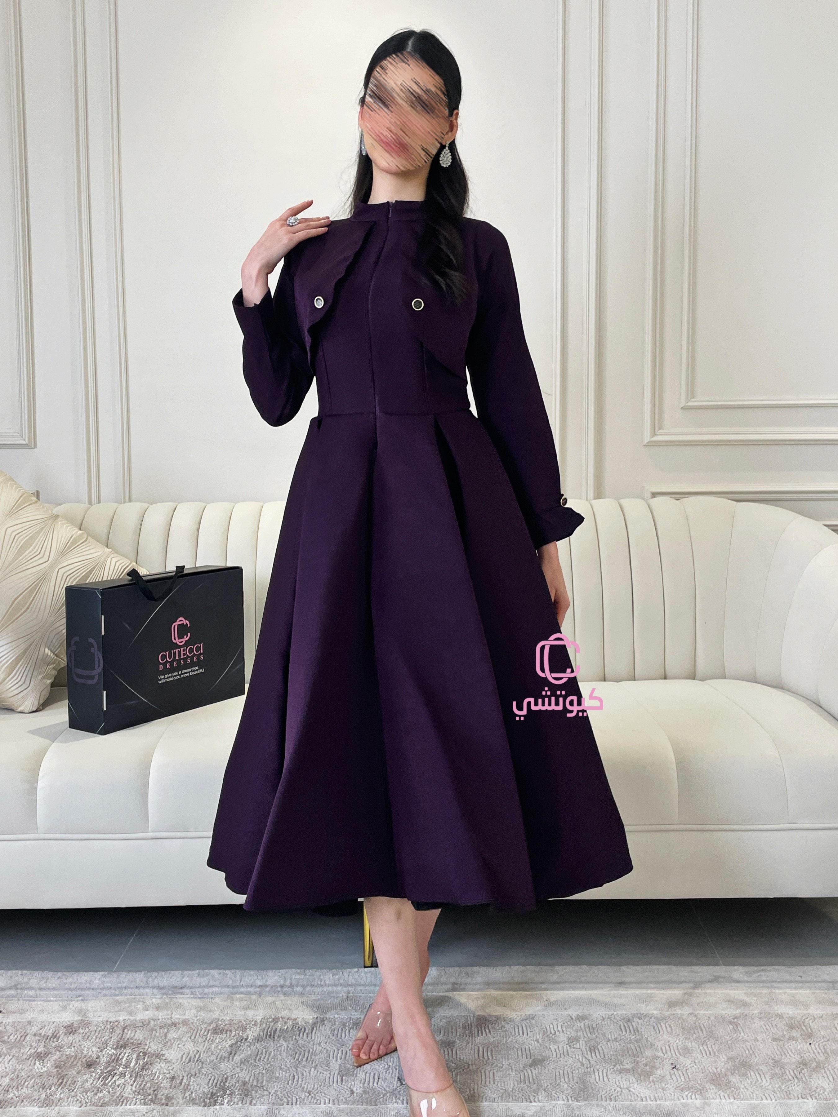 فستان موف ساتر بطبقة أمامية أنيقة من Cutecci، بتصميم راقٍ يجمع الاحتشام والعصرية، مصنوع من قماش ناعم وقصة فخمة، مثالي لمناسبات السهرة والعيد. احصلي عليه الآن من متجر Cutecci.